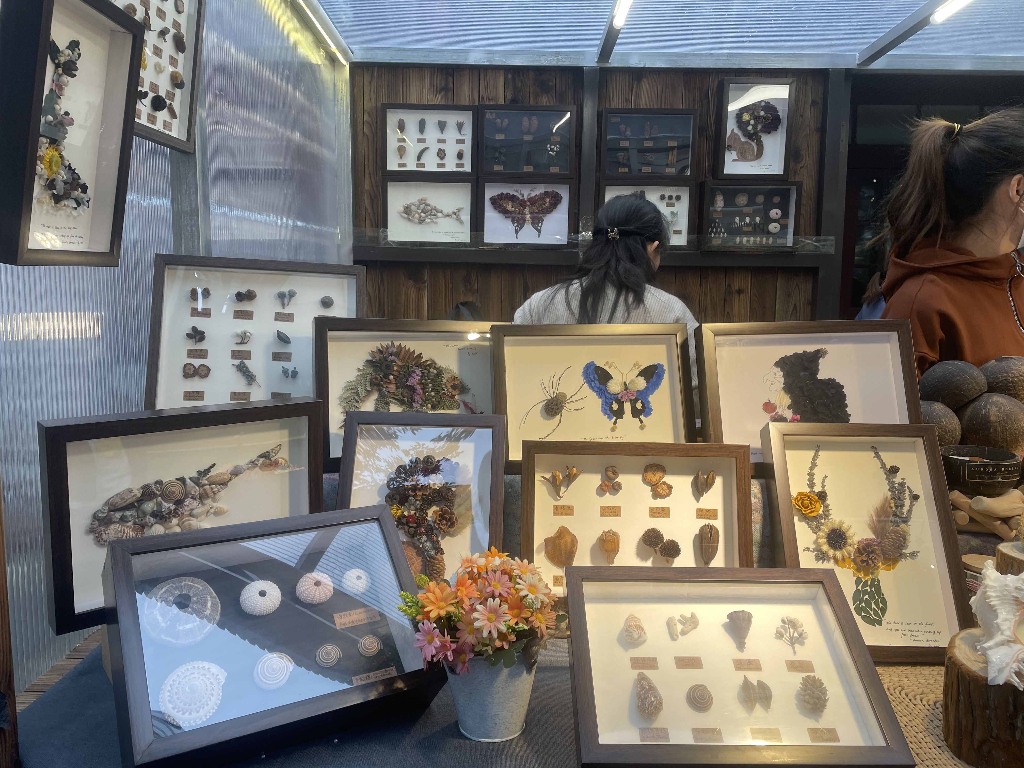作为小众香氛品牌AURORA BOREALIS的创始人,尼尼经常辗转于上海各个集市,用传统手工灌蜡工艺制成的天然椰壳香薰蜡烛、地中海贝壳夜灯蜡烛等广受好评。两周前一个偶然的机会,他接触到手工植物标本相框这种形式,觉得很有意思,于是决定尝试自己制作,“第一次带到集市展示,没想到就吸引了不少顾客。”