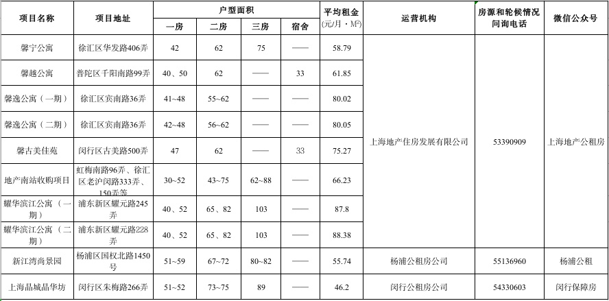2021年10月市筹公共租赁住房房源信息发布啦!包括徐汇区馨宁公寓、馨逸公寓,闵行区馨古美佳苑,浦东新区耀华滨江公寓等。有意向的市民或单位可联系本市公共租赁住房运营机构,具体联系方式详见: