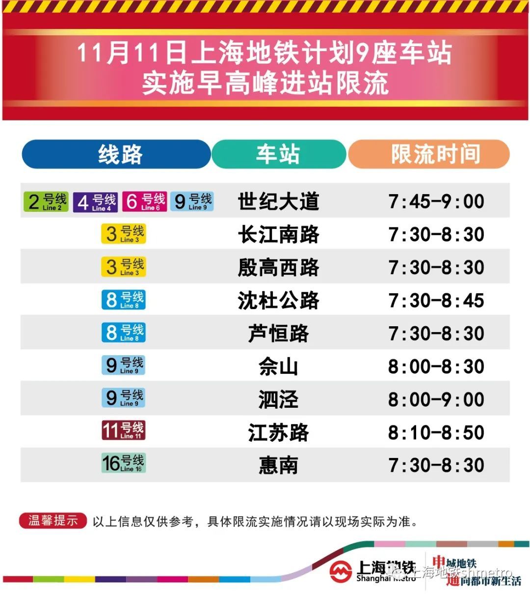 11月11日,上海地铁早高峰限流措施仍将继续,届时将有9座地铁站早高峰计划限流。