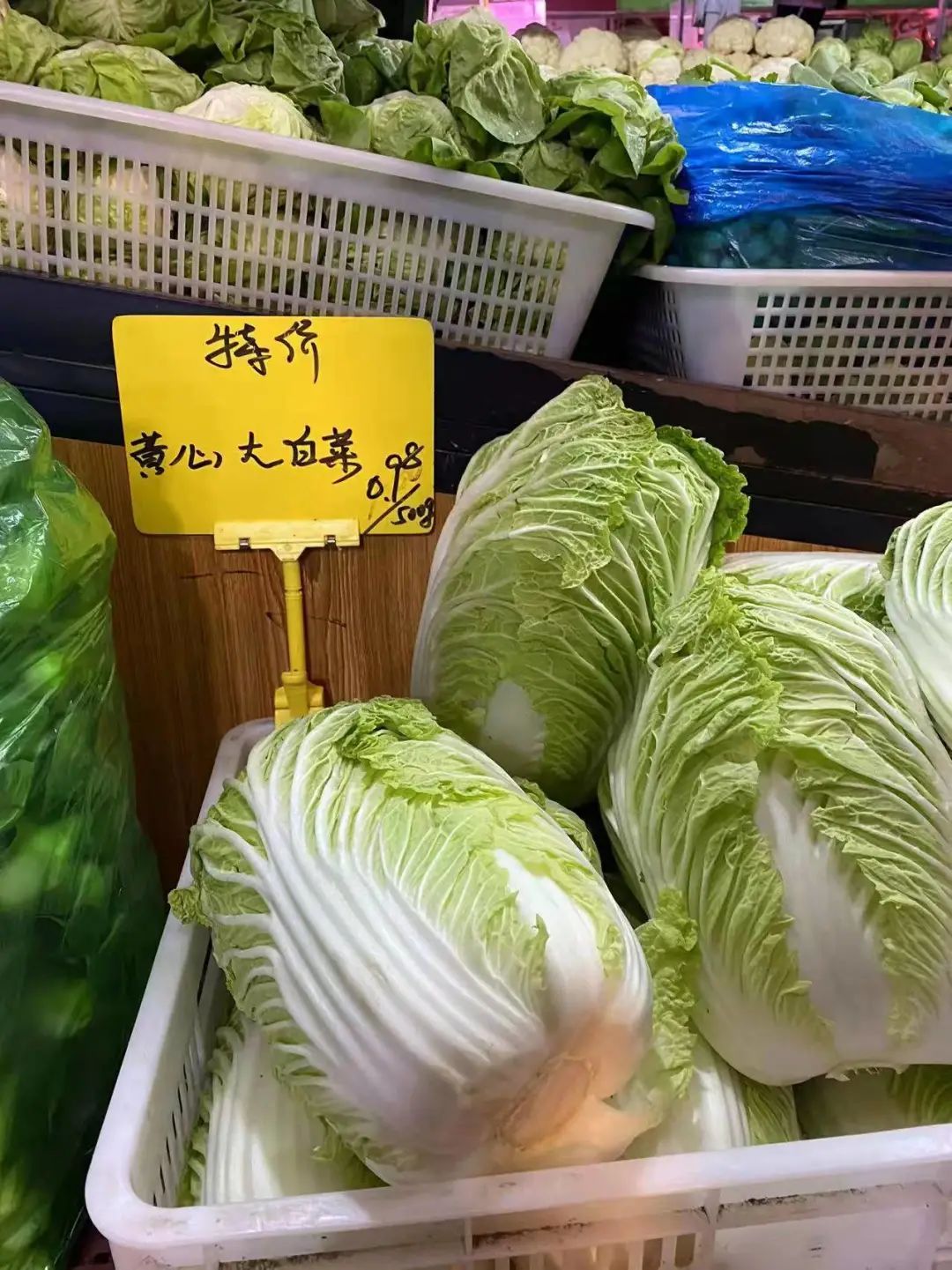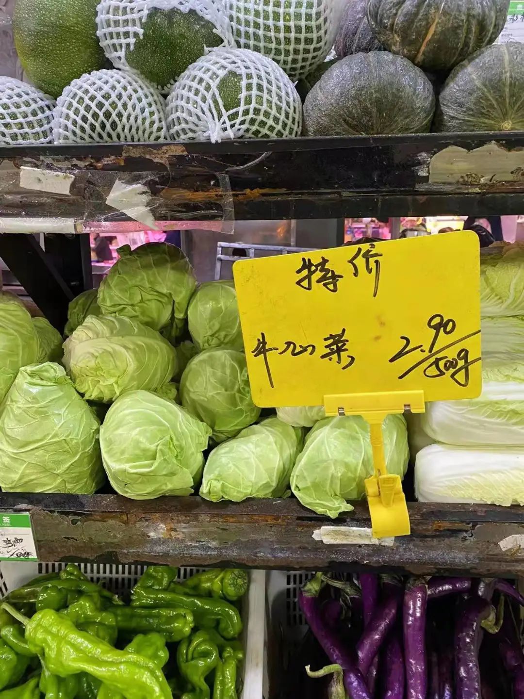 0.98元/500g的黄心大白菜、2.5元/500g的杭白菜、2.9元/500g的牛心菜……福泉路上的可乐农贸市场积极应对寒潮,不少摊主都备足了库存,还推出了许多特价菜。