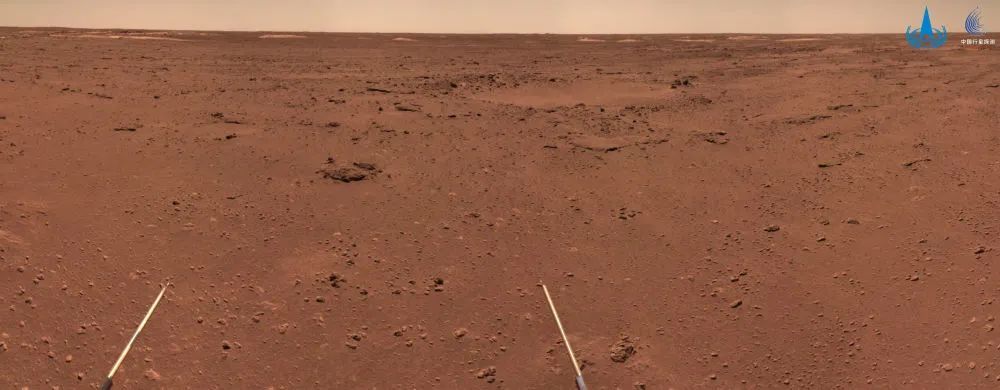 该图像由祝融号火星车近期利用导航地形相机获取的3幅图像拼接镶嵌而成,图中可以看到环形坑、石块等火星典型地貌。