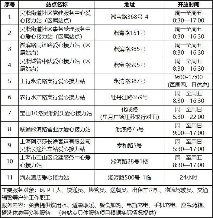 吴淞街道户外职工爱心接力站一览表