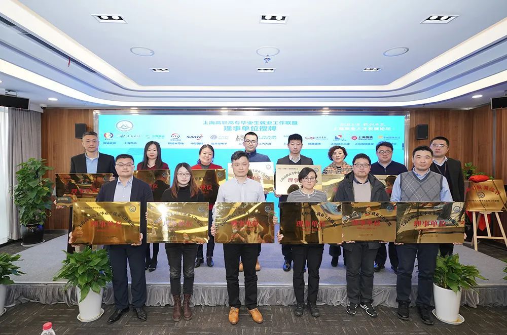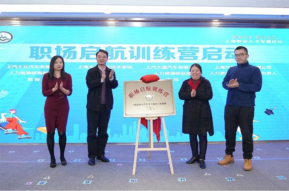 上海交通职业技术学院副校长顾剑锋与上汽大通、上汽大众、上汽变速器等单位人力资源负责人为“职场起航训练营”揭幕;市学生事务中心副主任周红星与联盟高校就业工作负责人共同启动“一生一策”数字化就业平台暨2022年高职高专春季系列招聘会;市人才服务中心主任丁峰为黄浦区就促中心、中国电信、中芯国际、上海建工等13家联盟首批理事单位授牌。