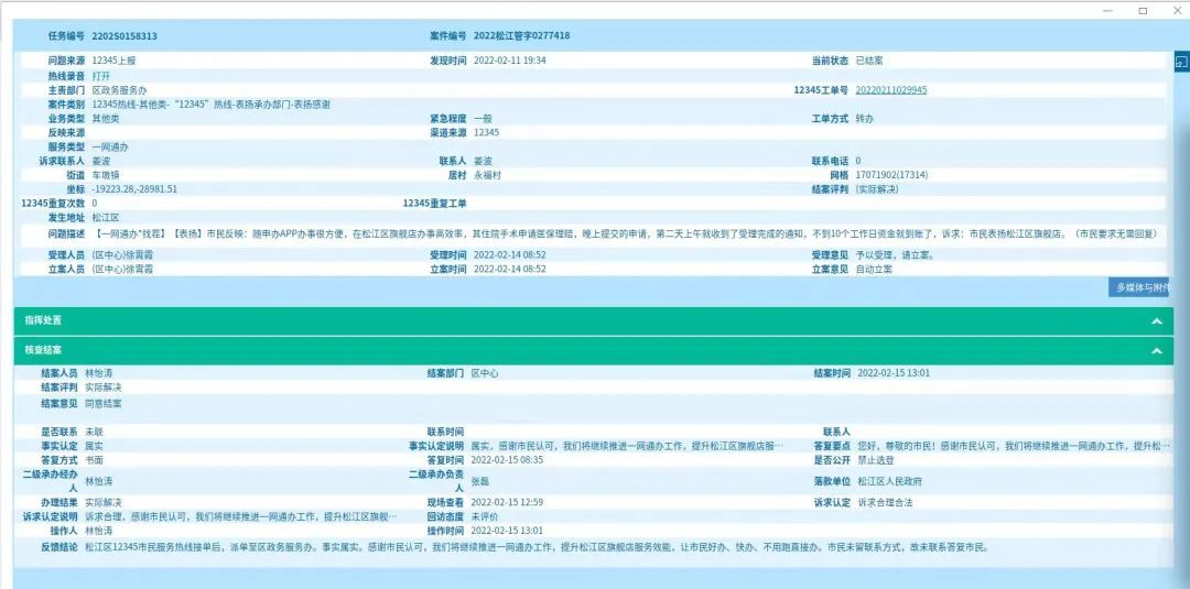 “‘随申办’很方便!我晚上在‘松江区旗舰店’申请在职职工住院理赔,第二天一早就显示成功受理,不到10个工作日理赔款就到账了,向你们表示感谢!”日前,松江区车墩镇居民姜波致电12345市民服务热线,为松江区“一网通办”服务点赞。