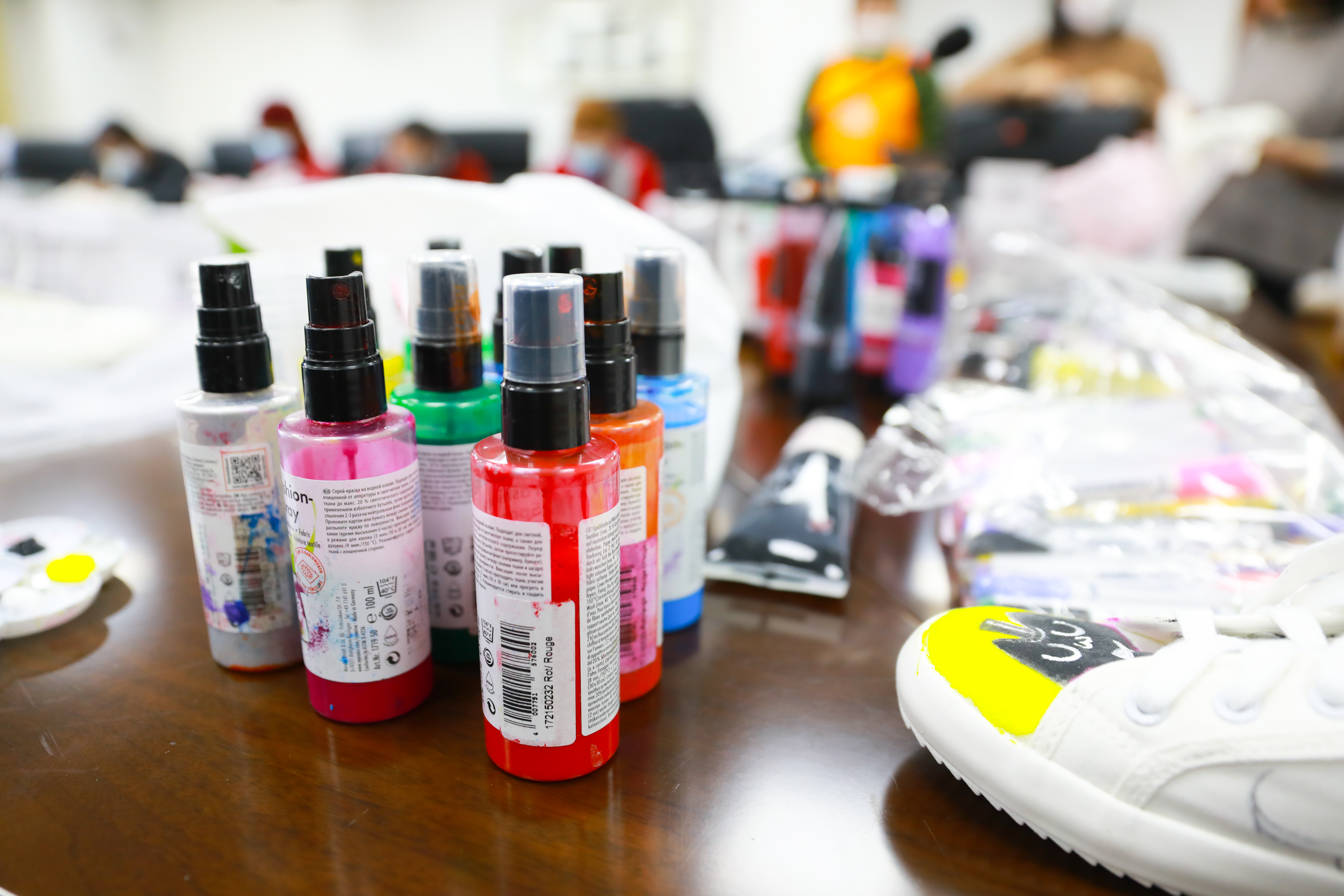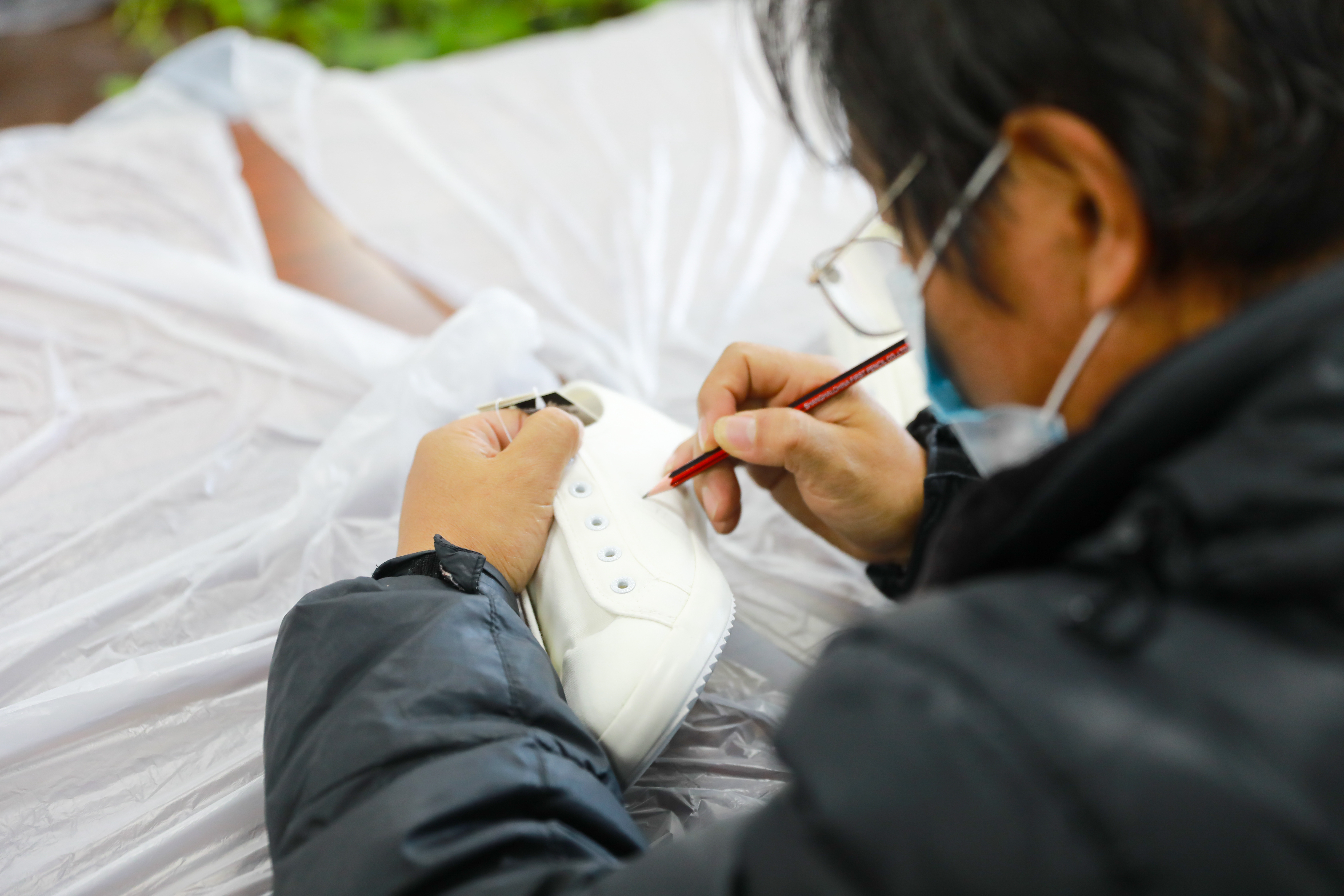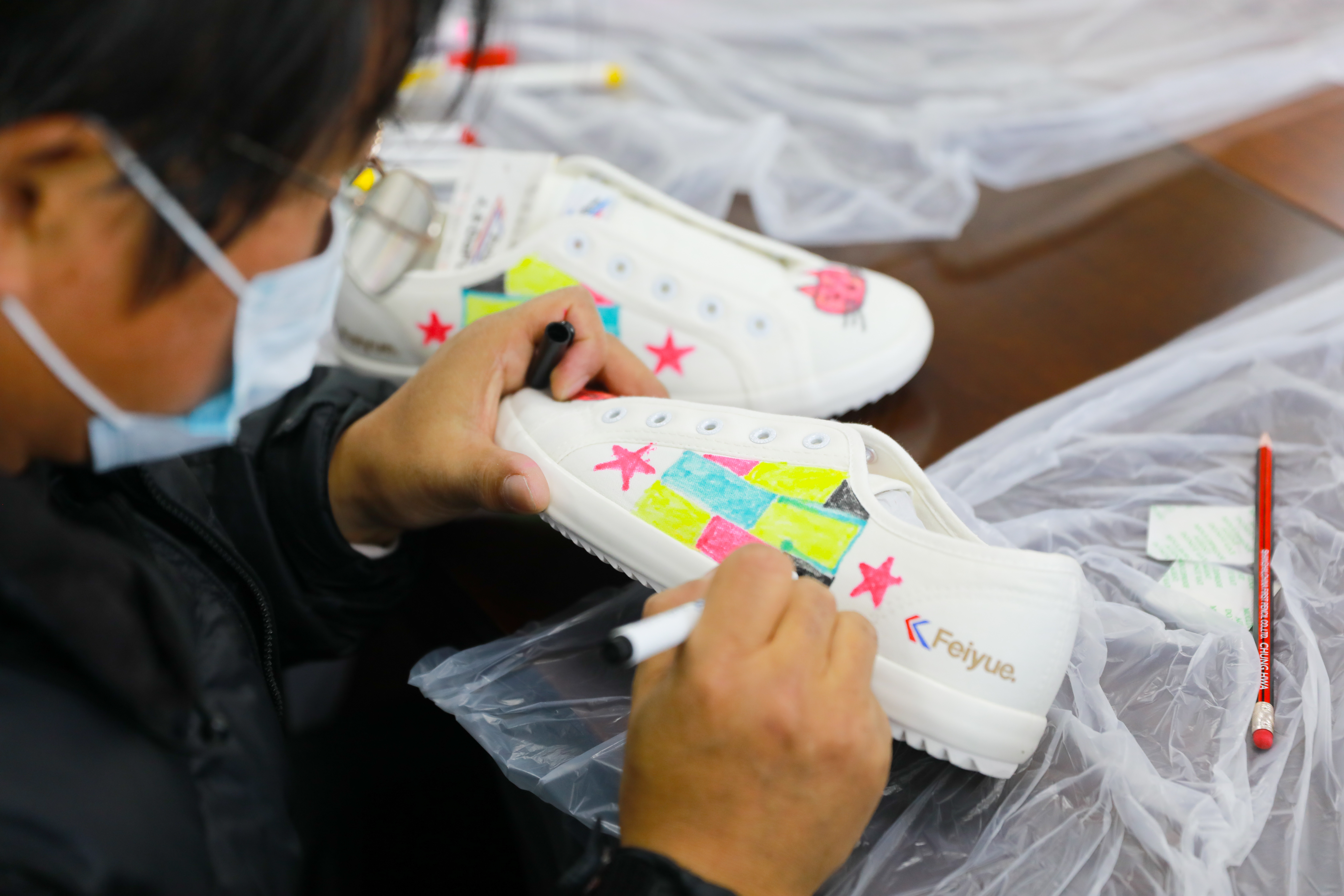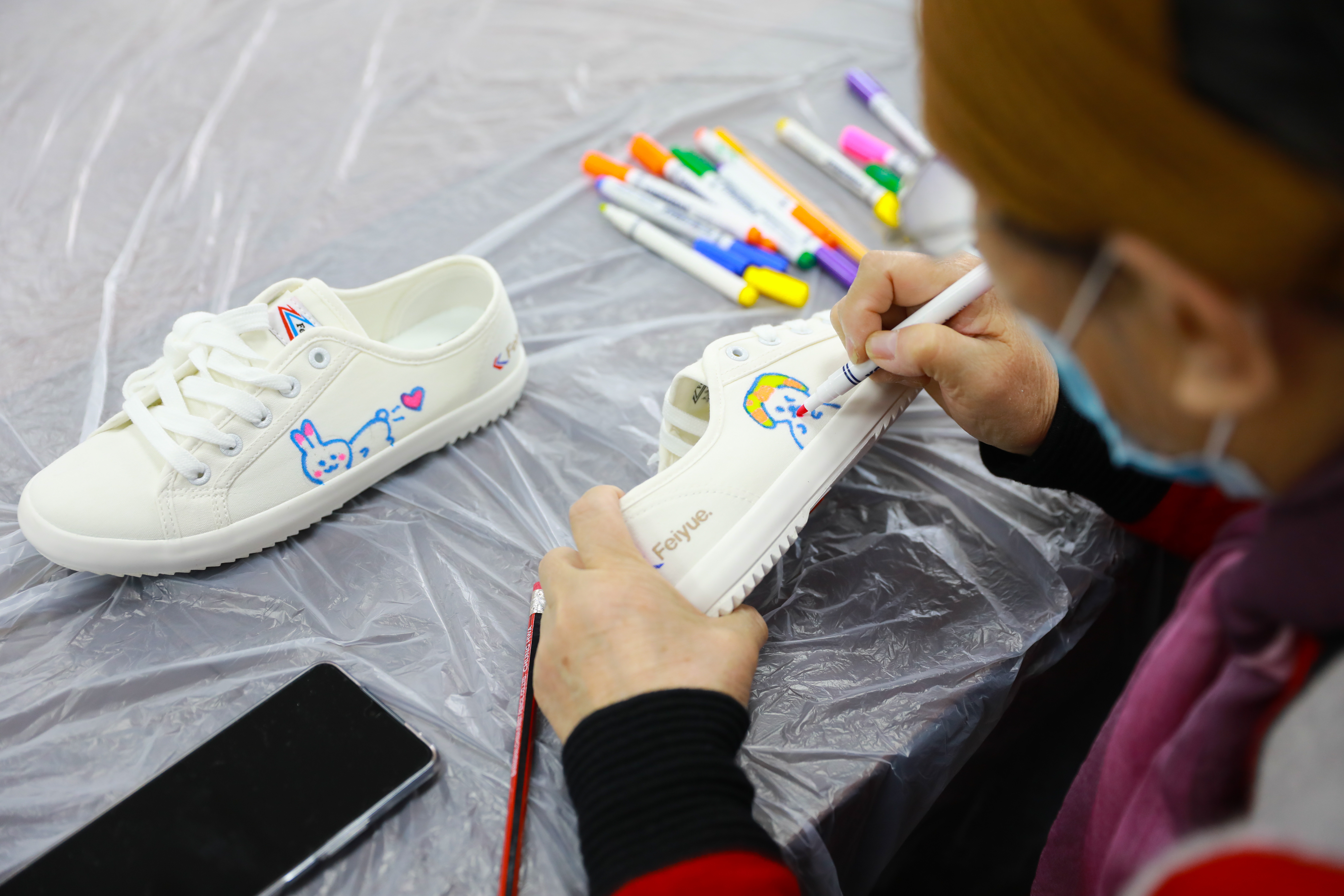 活动现场,老师通过讲解向大家介绍在鞋面上作画的技巧:首先用铅笔在布鞋上画草稿,要注意图案的整体布局;然后在鞋面上勾出细细的轮廓,定下线稿,再用防水纺织笔或丙烯颜料上色,也可以用喷绘的方式大面积上色。“上色的时候要注意,色彩没有干的时候,小心碰到鞋面,造成画面的脏乱。”作画过程中,老师提醒大家。