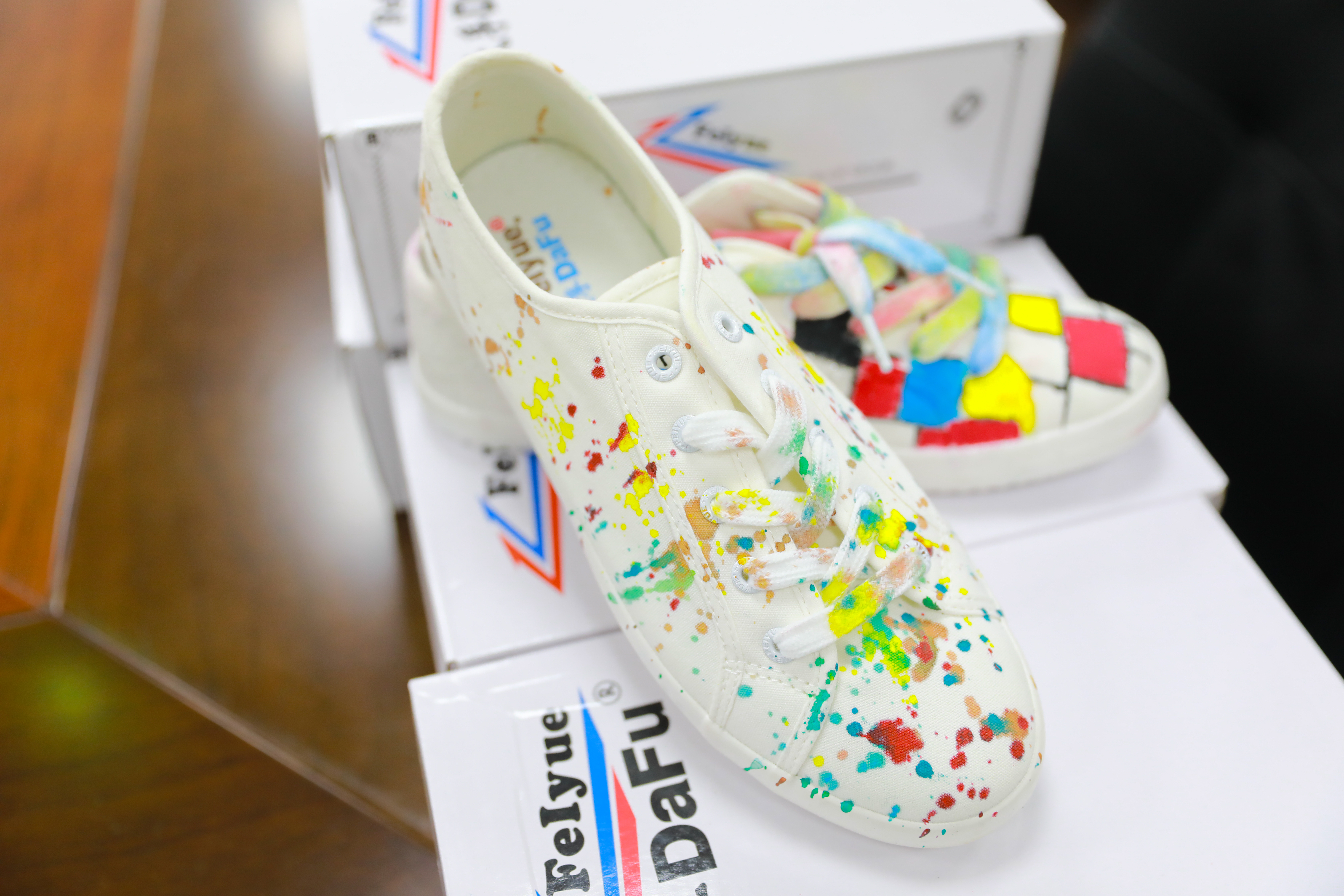 记者在现场看到,有的居民画了五角星、老虎、兔子等图案,有的居民画了大面积撞色的色块,显得非常时尚,还有的将家人的卡通形象画在了鞋面上。绘画完成后,大家将鞋子放在阴凉处,待自然风干或使用电吹风吹干后,作品便大功告成了。“自己动手画的鞋面比印刷品更具欣赏价值,因为这些图案都是自己喜欢的。”现场一名居民说道。