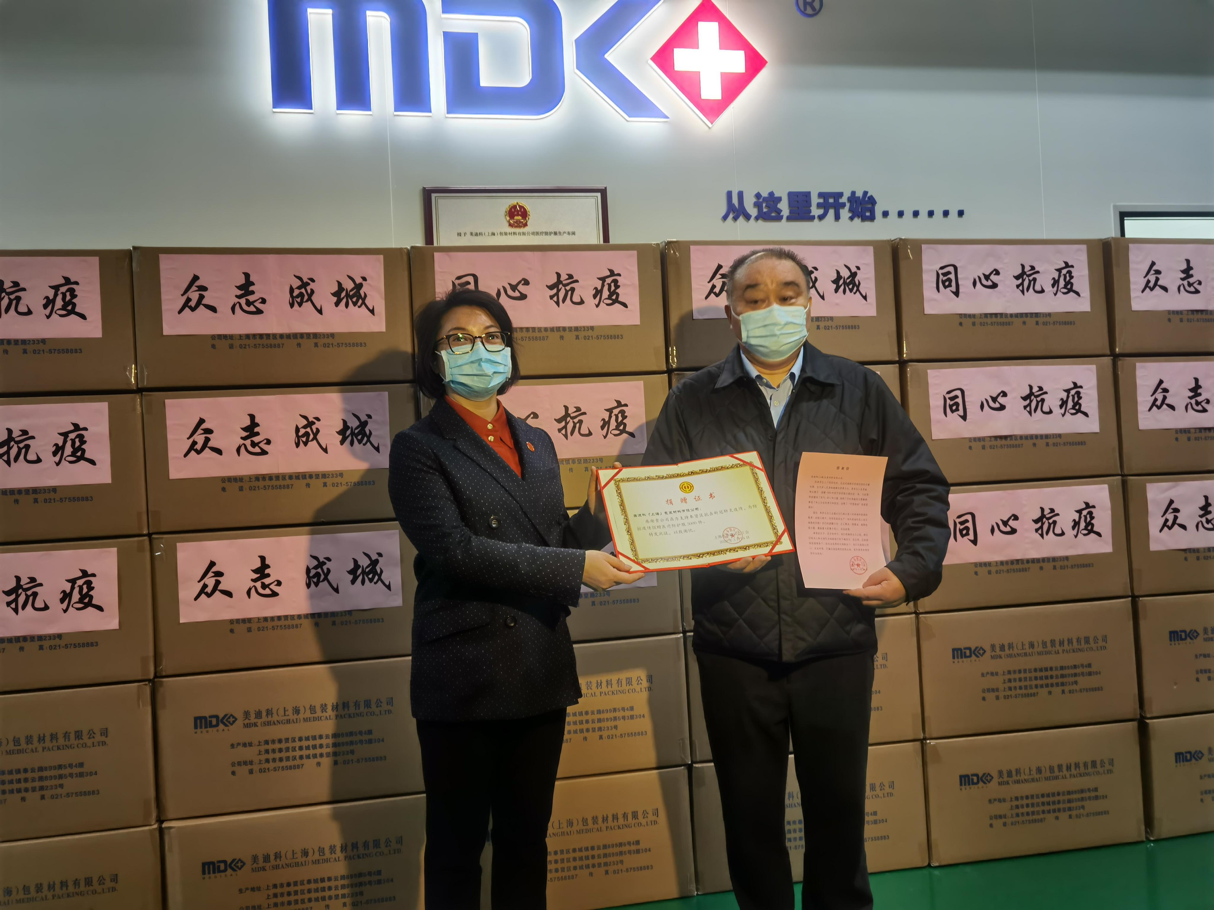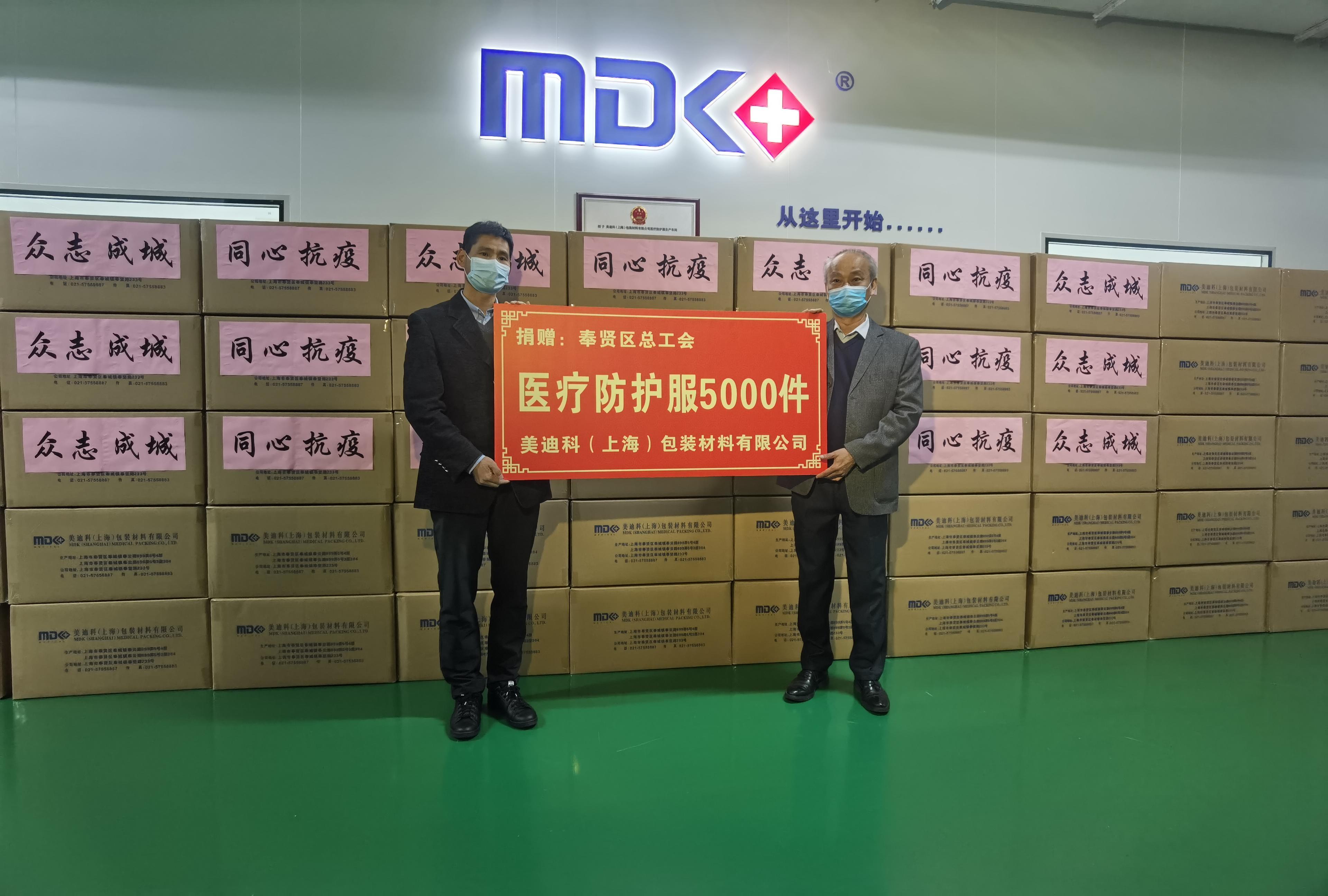 3月24日下午,专门从事医疗防护服生产的美迪科(上海)包装材料有限公司向奉贤区总工会捐赠5000件医疗防护服。这批医疗防护服将分发至送到各基层工会用以支援抗疫一线。