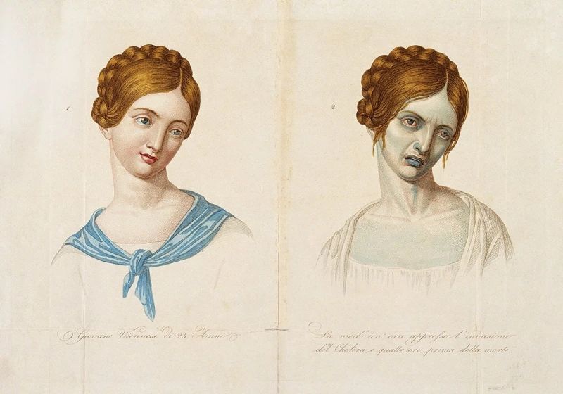 1831年欧洲首次爆发霍乱,维也纳一名23岁的年轻女子染病的前后对比。绘制第二幅图像时,她染病仅一小时,而在图像完成四小时后她就撒手人寰。