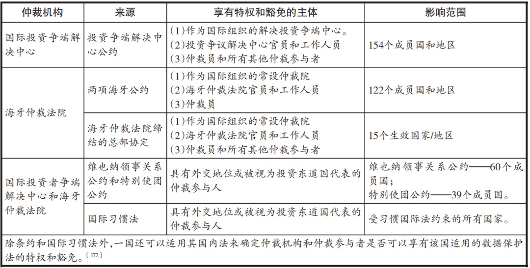 在国际公法中,特权和豁免是指保障国际组织及其官员、主权国家及其具有外交地位的工作人员和其他人员独立履行职责和义务,以实现国际组织或国家的目标。特权通常是指对一国原本适用的实体法的豁免,而豁免则是对一国行政、裁决或行政权力的豁免。在本文中,“特权”指的是不适用当地数据保护法,“豁免”指的是管辖豁免,即免除违反当地法律的任何程序的管辖权。它们产生了同样的否定效果,即当地的数据保护法对投资仲裁及其参与者没有影响。