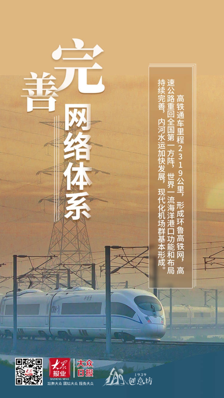 高铁通车里程2319公里,形成环鲁高铁网,高速公路重回全国第一方阵,世界一流海洋港口功能和布局持续完善,内河水运加快发展,现代化机场群基本形成。