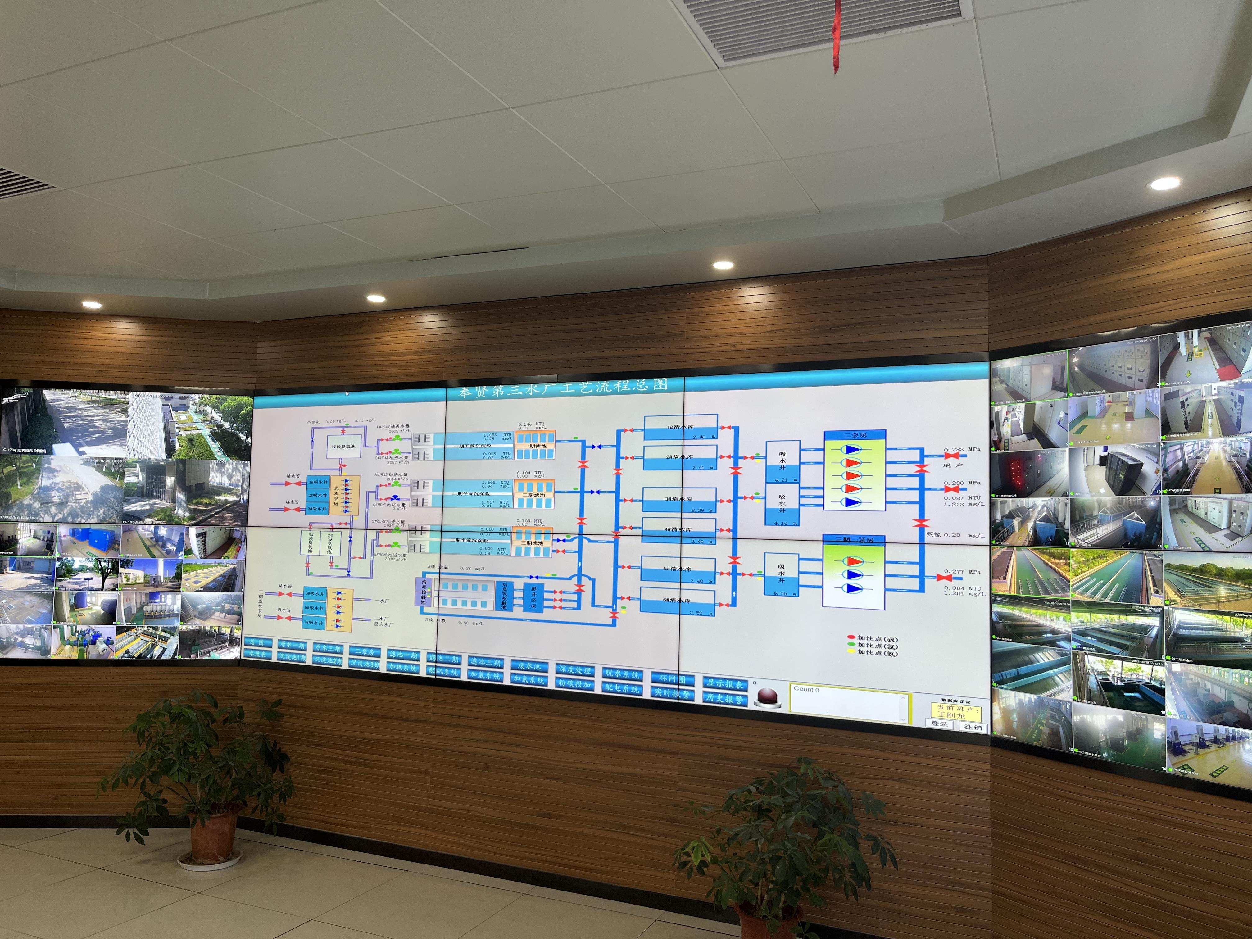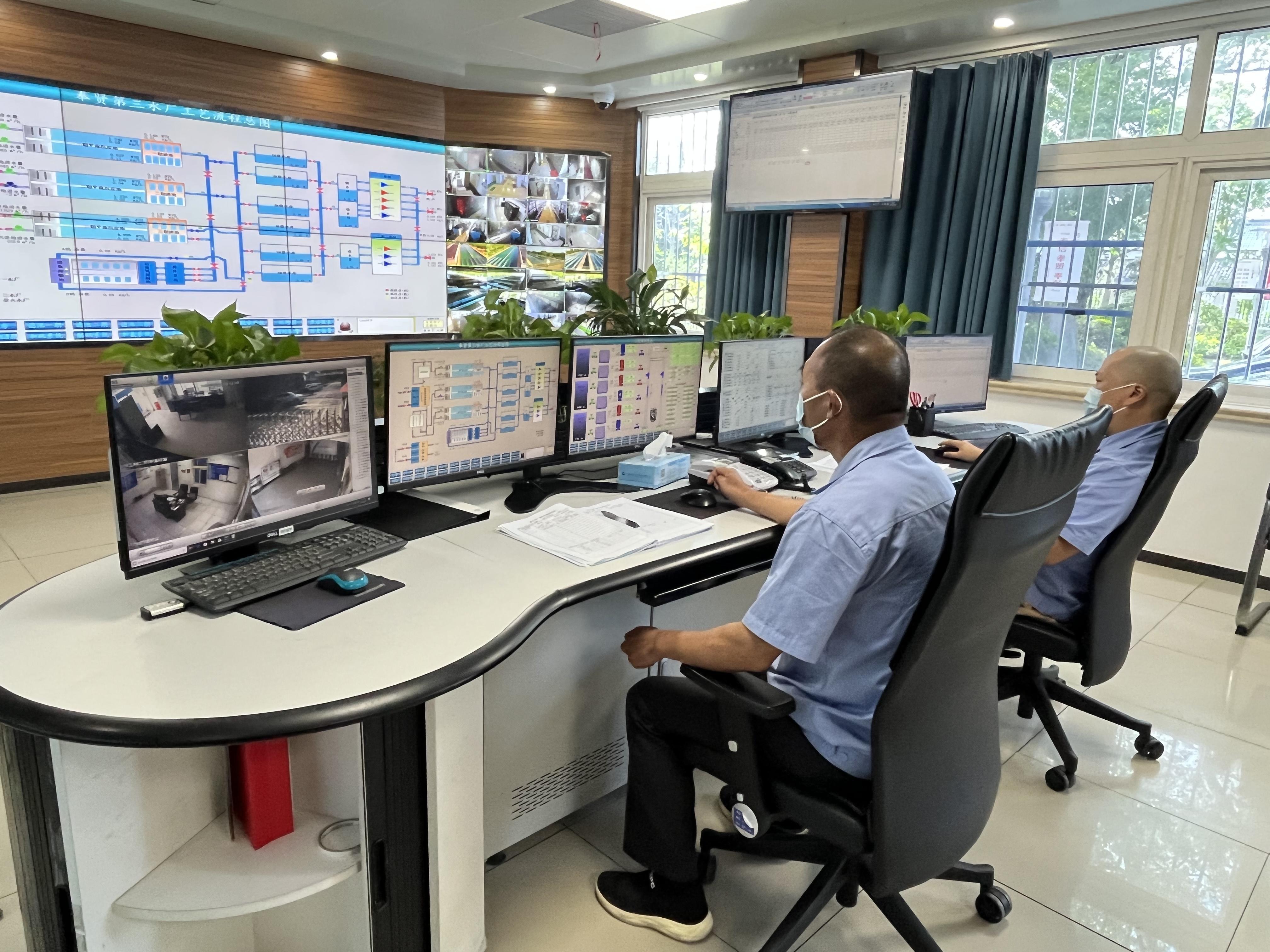 在三水厂的调度中心,值班工作人员正在对出厂水量和水压进行严密监控,全程数字化控制设施设备,水泵、沉淀池、过滤池、深度处理池都有条不紊地运作,并根据指令加以实时调度和分配。