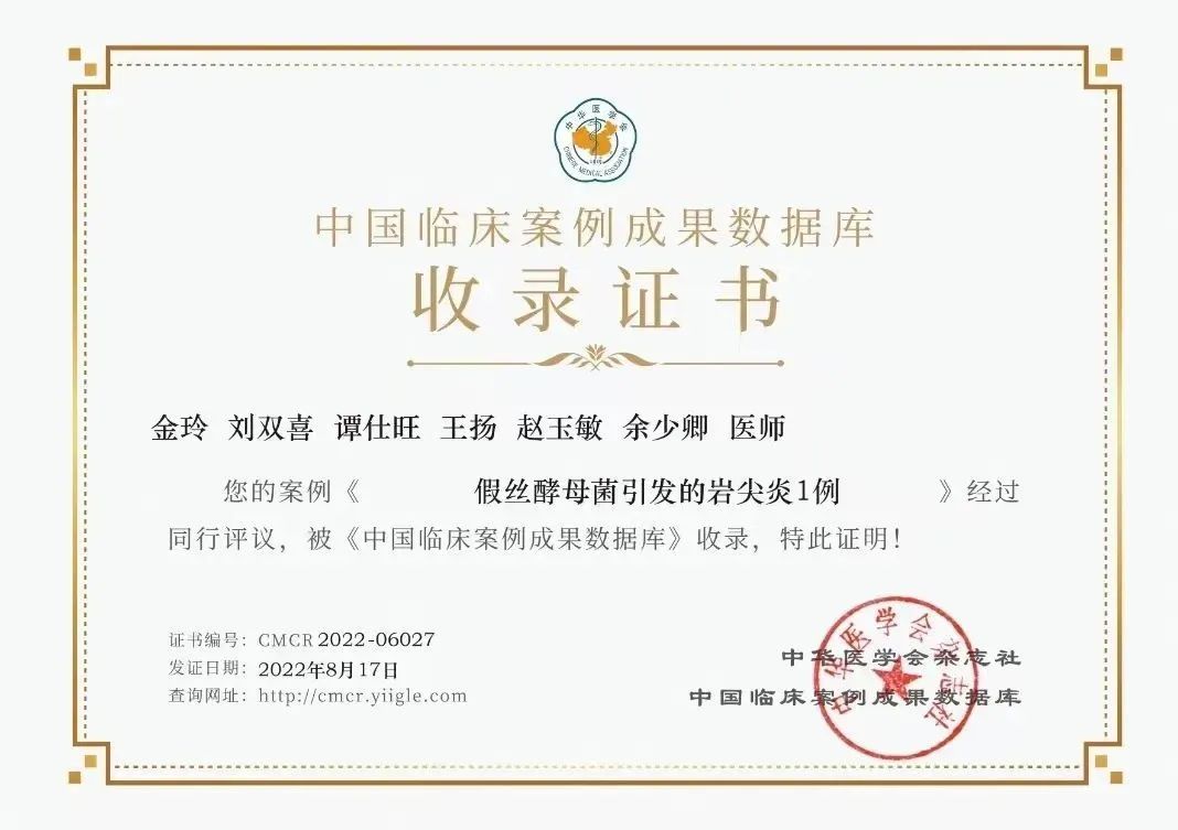 近日,同济大学附属同济医院耳鼻咽喉头颈外科一临床病例报告首次被《中国临床案例成果数据库》收录。去年9月,我院耳鼻咽喉头颈外科收治了一例极少见的由假丝酵母菌引发的岩尖炎。岩尖炎是一种非常少见的中耳炎并发症,其临床表现包括耳流脓、头痛及外展神经麻痹的三联征,也称“岩尖综合征”。当中耳感染波及岩尖时,该区的三叉神经节和第六脑神经产生损害,导致面深部疼痛及复视等症状。现今中耳炎所致的并发症日益减少,也因此导致医生对其认识不足。未被识别和治疗不当的岩尖炎可引起重要的并发症甚至死亡。该病例为老年男性,左耳持续流脓3个月,伴同侧耳痛、头痛。入院行乳突根治术后耳流脓改善,但左侧头痛日渐明显,并相继出现左侧周围性面瘫、眩晕及复视等症状。患者最终经二次病理及血mNGS检测确诊为耐药的真菌感染导致的岩尖炎,在选用敏感抗真菌药物治疗后痊愈。