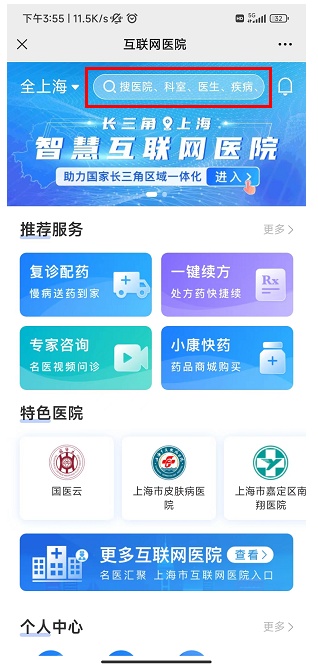 入口2:“上海健康云”app,选择“互联网医院”,在互联网医院首页,搜索框搜索“赵巷”。