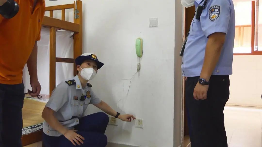 随后,检查人员对学校住宿区域进行检查,重点针对房间内插座等用电部位进行检查。校方介绍,这里不允许带拖线板,而且插座都是断电的。民警提醒,学生去训练或者上课的时候,宿管要对每个房间进行巡检,防止遗留的火种或者是外来的火种,包括空调。