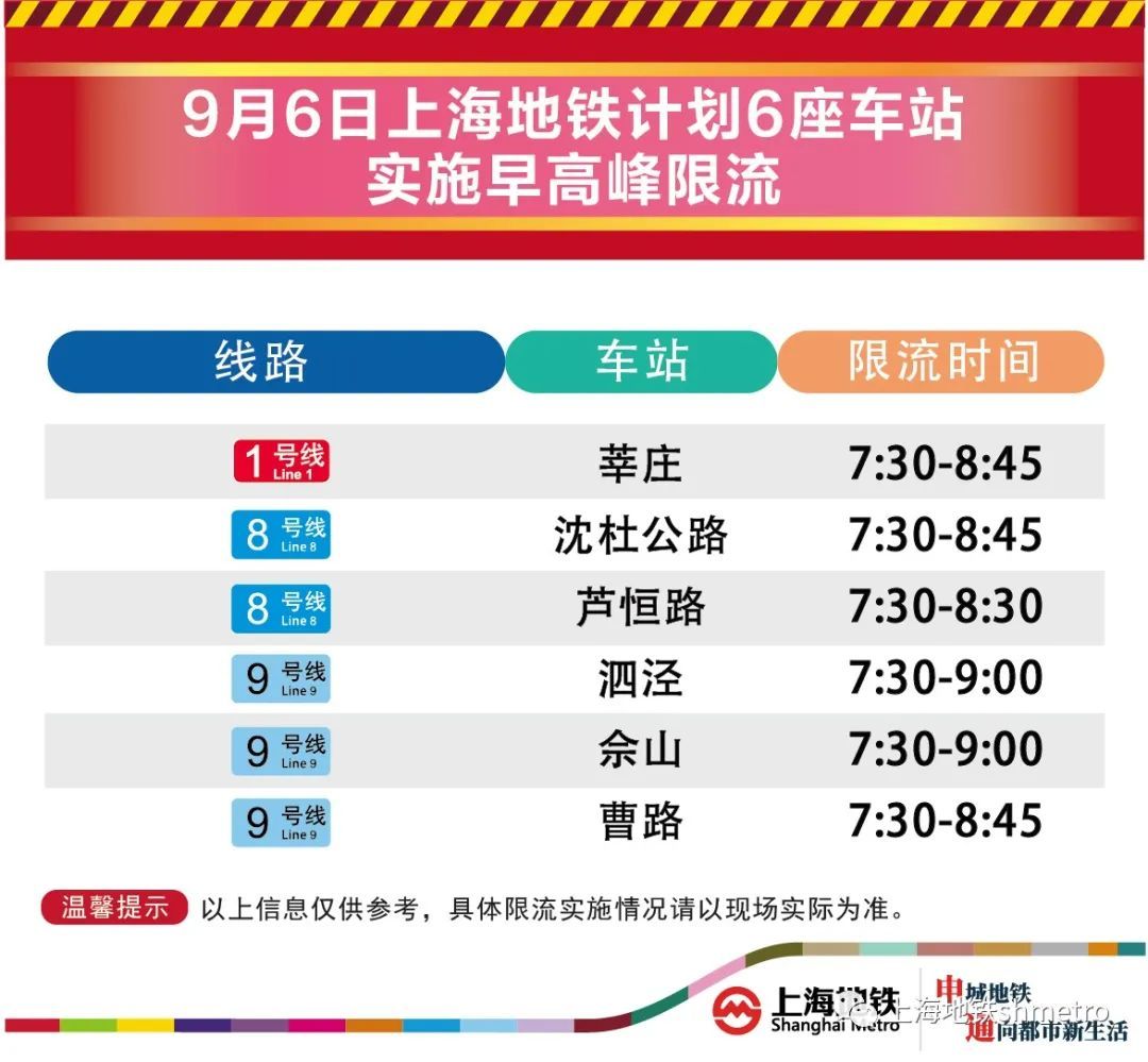 9月6日,上海地铁早高峰限流措施将继续实施,届时将有6座地铁站早高峰计划限流。