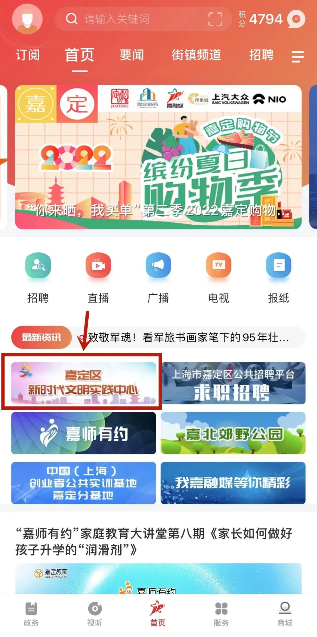 2、点击首页“嘉定区新时代文明实践中心”