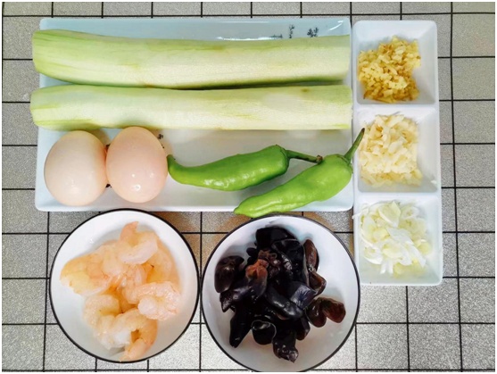 丝瓜、鸡蛋、虾仁、