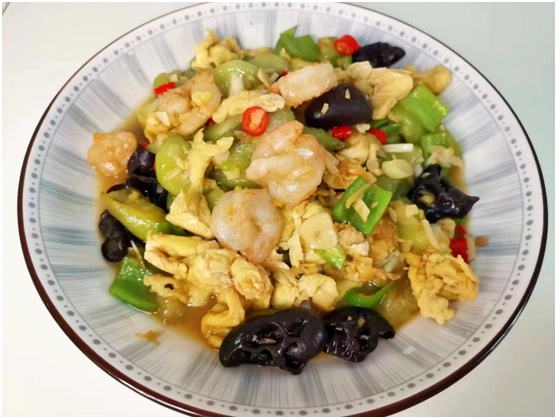 最后放青椒、鸡蛋和虾仁进行翻炒,