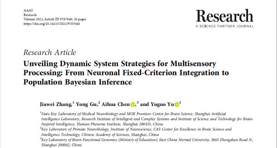 8月20日,智能复杂体系基础理论与关键技术实验室于玉国教授课题组与华东师范大学陈爱华研究员课题组和神经所顾勇研究员课题组合作,共同在SCIENCE合作期刊Research在线发表了题为“Unveiling Dynamic System Strategies for Multisensory Processing: From Neuronal Fixed-Criterion Integration to Population Bayesian Inference”的研究论文,该研究为揭示高等动物多感觉脑区进行多模态信息整合计算和认知推断策略方向提供了基础的生物物理理论机制,对脑启发的人工智能模型进行多模态信息整合计算具有重要启示。