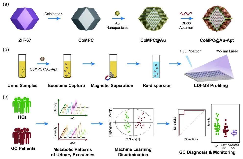 近日,化学系邓春晖教授团队,附属中山医院沈锡中教授团队成员孙念荣副研究员报道了整合提取外泌体代谢特征用于早期胃癌检测的相关研究。本文设计合成了适配体偶联多态碳材料,可同时作为高效捕获外泌体的吸附剂以及激光解吸/电离质谱(LDI-MS)的优良基质,用于连续地富集尿液外泌体及提取其代谢特征,实现了胃癌的精确早期诊断及发展监测。相关研究成果发表在ACS Nano上。