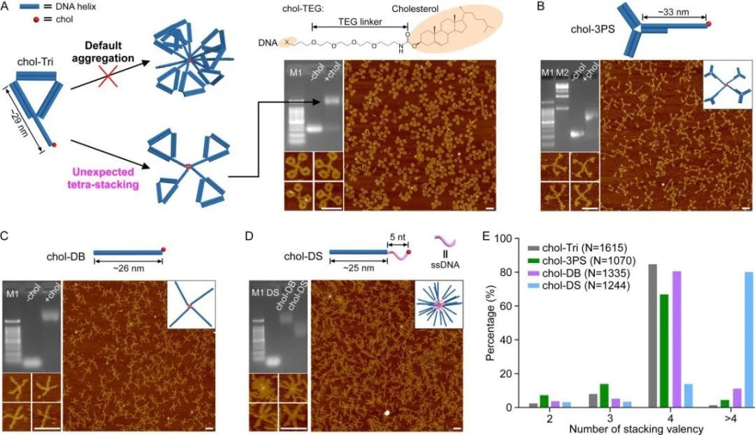8月30日,生物医学研究院顾宏周团队在Journal of the American Chemical Society期刊上发表题为“Programmable Assembly of Amphiphilic DNA through Controlled Cholesterol Stacking”的工作,通过深入研究带有胆固醇修饰的DNA组装体的聚集行为,发现了修饰在双链DNA平末端的胆固醇倾向于诱导“胆固醇-DNA”形成显著的四聚体,而非先前普遍认为的胶束样多聚体。进一步的研究表明,平末端的胆固醇四价堆叠与DNA组装体的形状无关,且四聚的行为显著依赖于DNA的平末端。