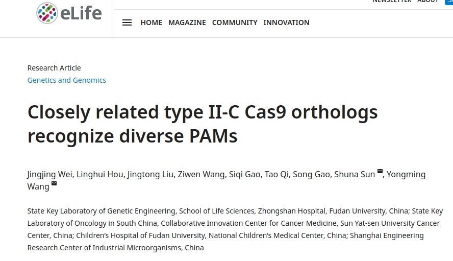 8月12日,生命科学学院王永明课题组在eLife上在线发表了题为“Closely related type II-C Cas9 orthologs recognize diverse PAMs”的研究论文。鉴定了25个Cas9的PAM,首次揭示了蛋白同源度很高的Type II-CCas9识别PAM的多样性。该研究有助于开发新的Cas9工具。