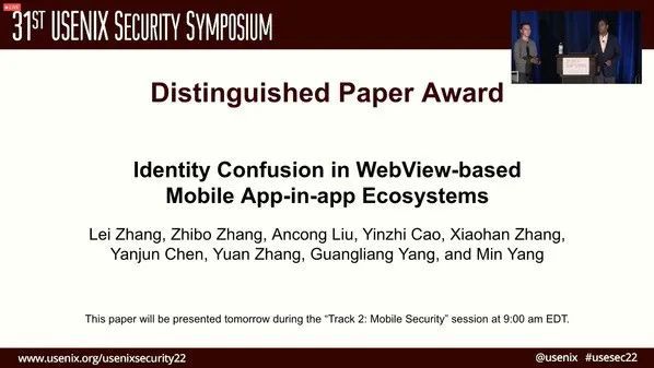 近日,复旦大学计算机科学技术学院杨珉教授领衔的系统与软件安全实验室发表的论文“Identity Confusion in WebView-based Mobile App-in-app Ecosystems”,荣获网络安全国际顶尖学术会议31st USENIX Security Symposium杰出论文奖(Distinguished Paper Award)。该论文聚焦移动应用小程序的生态安全问题,揭示微信、支付宝、抖音、今日头条等一批主流软件面临的安全威胁,帮助避免数十亿用户的信息安全风险。