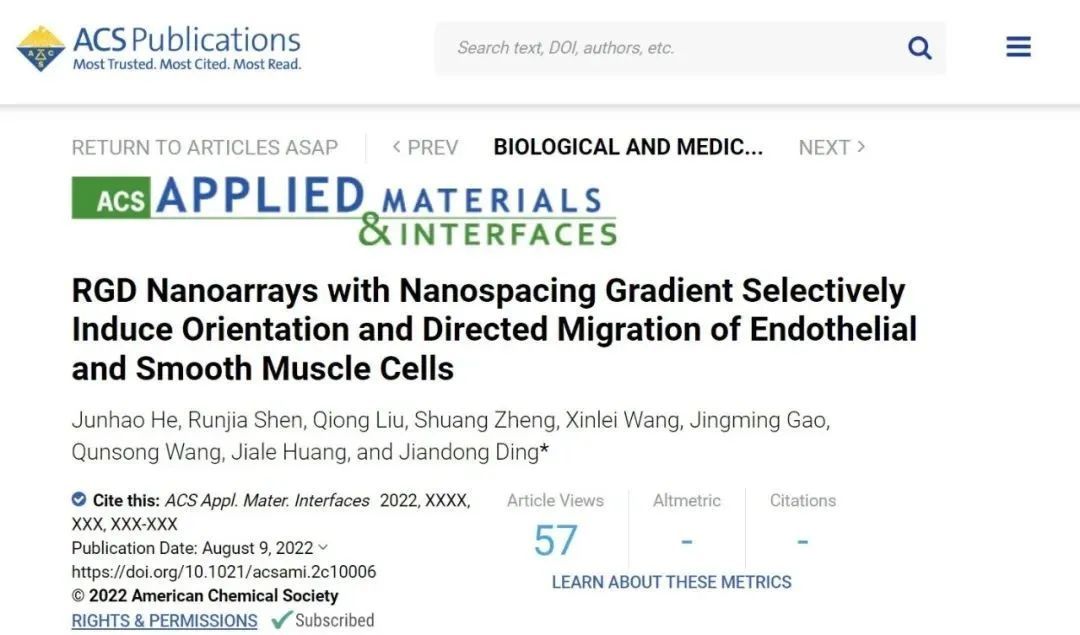 近期,高分子科学系丁建东课题组基于嵌段共聚物胶束纳米蚀刻技术( block copolymer micelle nanolithography, BCMN),成功制备了纳米间距梯度变化的金点阵列。内皮细胞、平滑肌细胞两种细胞对梯度变化的 RGD 纳米间距的响应差异为将来的细胞筛选、促伤口愈合的细胞选择性材料的表面修饰提供了新的思路。上述研究成果以“RGD nanoarrays with nanospacing gradient selectively induce orientation and directed migration of endothelial and smooth muscle cells”为题发表在《ACS AMI》上。