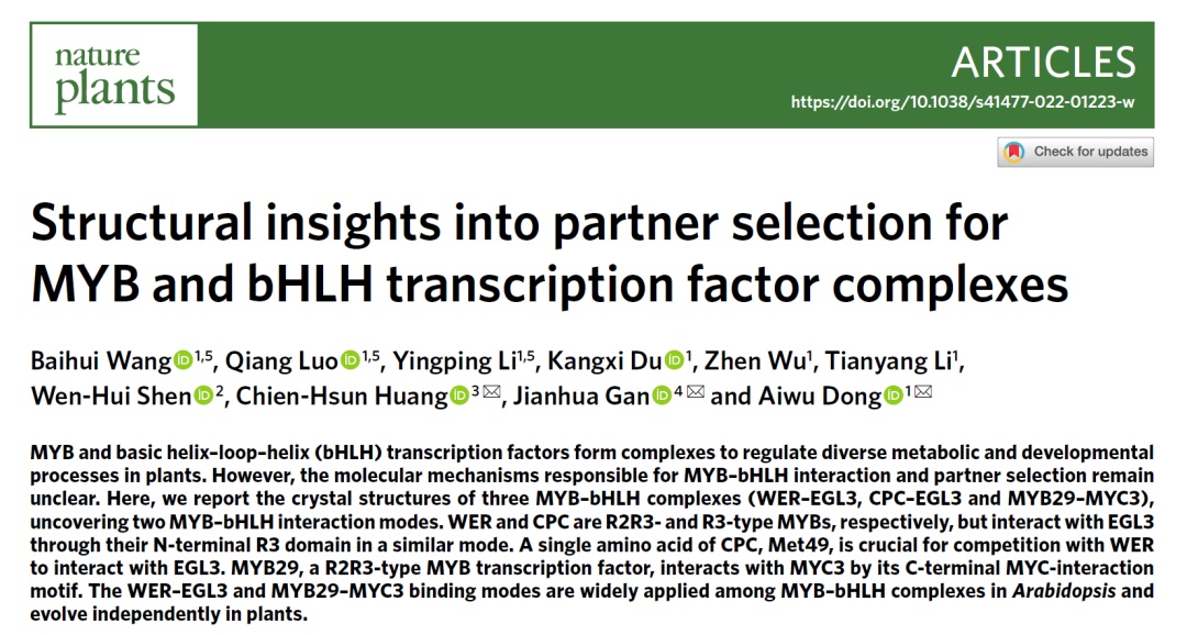2.生命科学学院董爱武、甘建华和黄建勋团队合作揭示植物不同MYB和bHLH转录因子选择伙伴形成复合物的分子机制