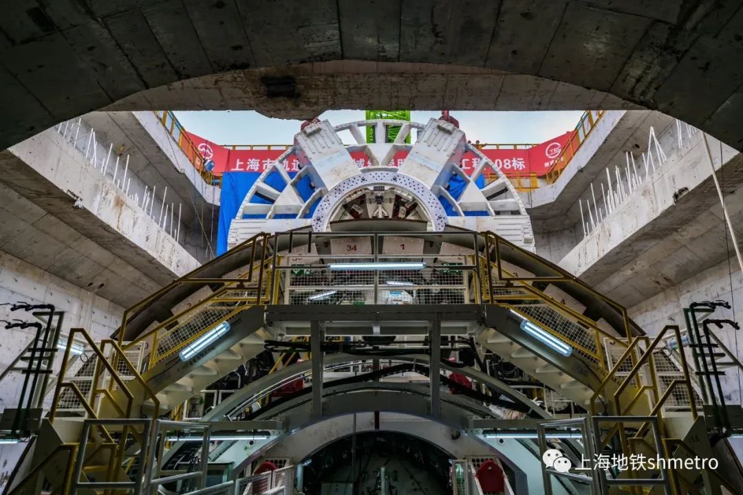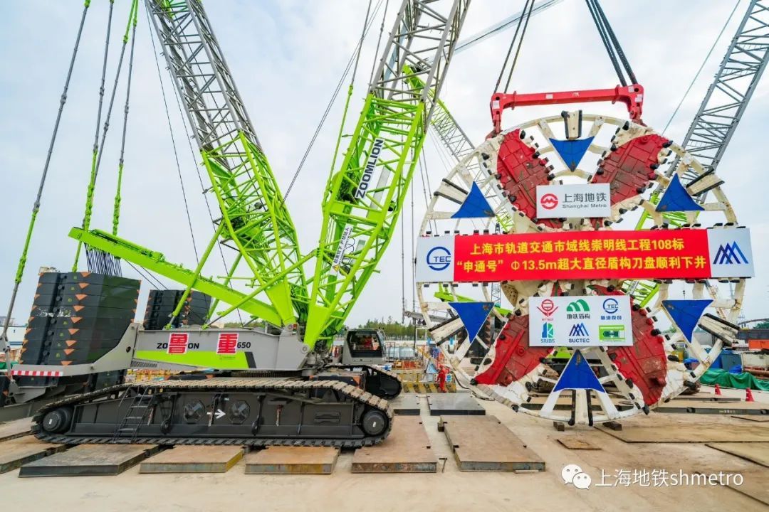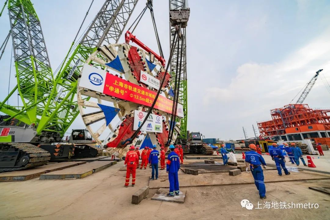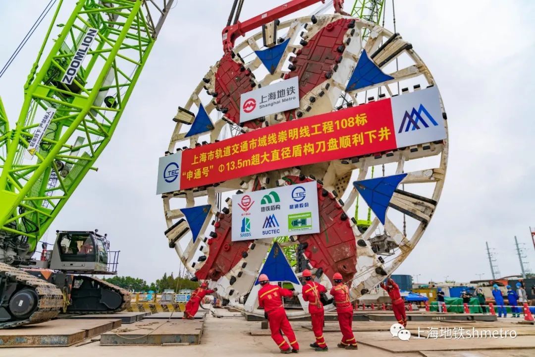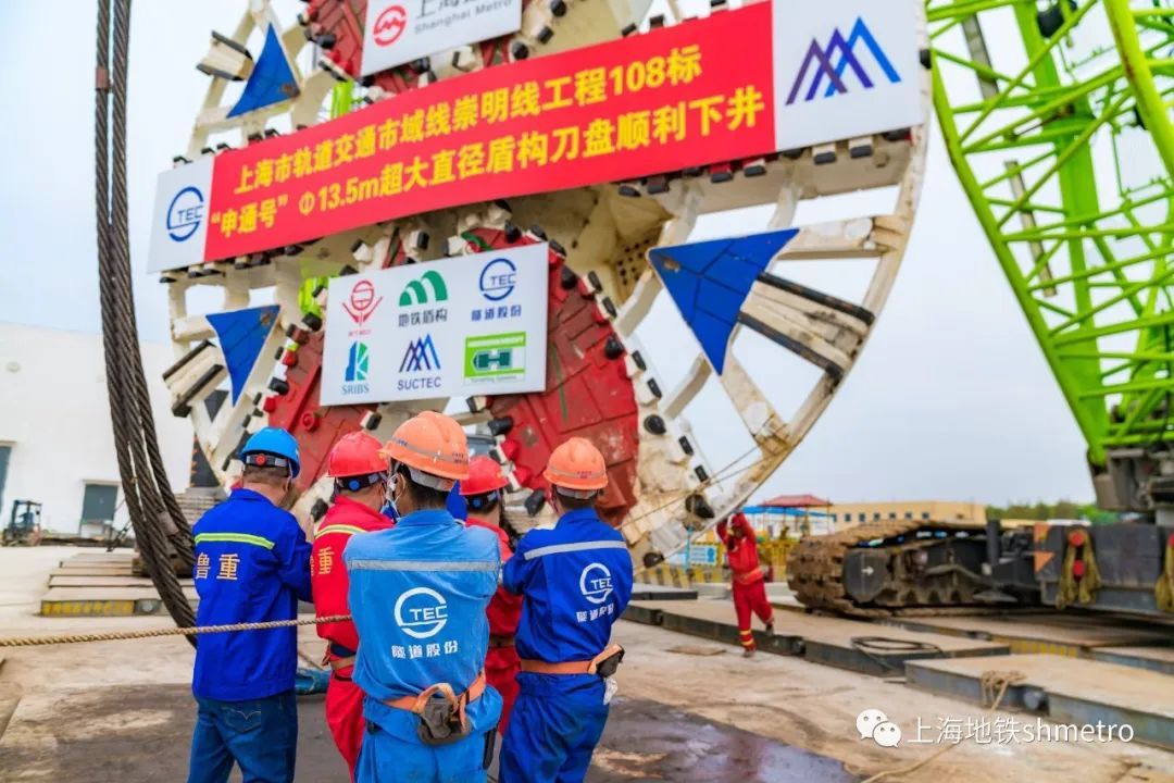 “申通号”盾构机总长148米,为泥水气平衡盾构机,采用常压刀盘设计,整机10bar压强耐压设计,配置应急避难仓和自动喷淋及水幕系统,并满足8.4米超宽“弓”型件安装设计。盾构机刀盘直径13.5米,重308吨,由一个中心块、6个主刀臂,6个辅刀臂焊接拼装组成。刀盘采用分块运输现场焊接方式,历时25天完成焊接拼装。先期,崇明线108标工作井主体结构已全部完工。