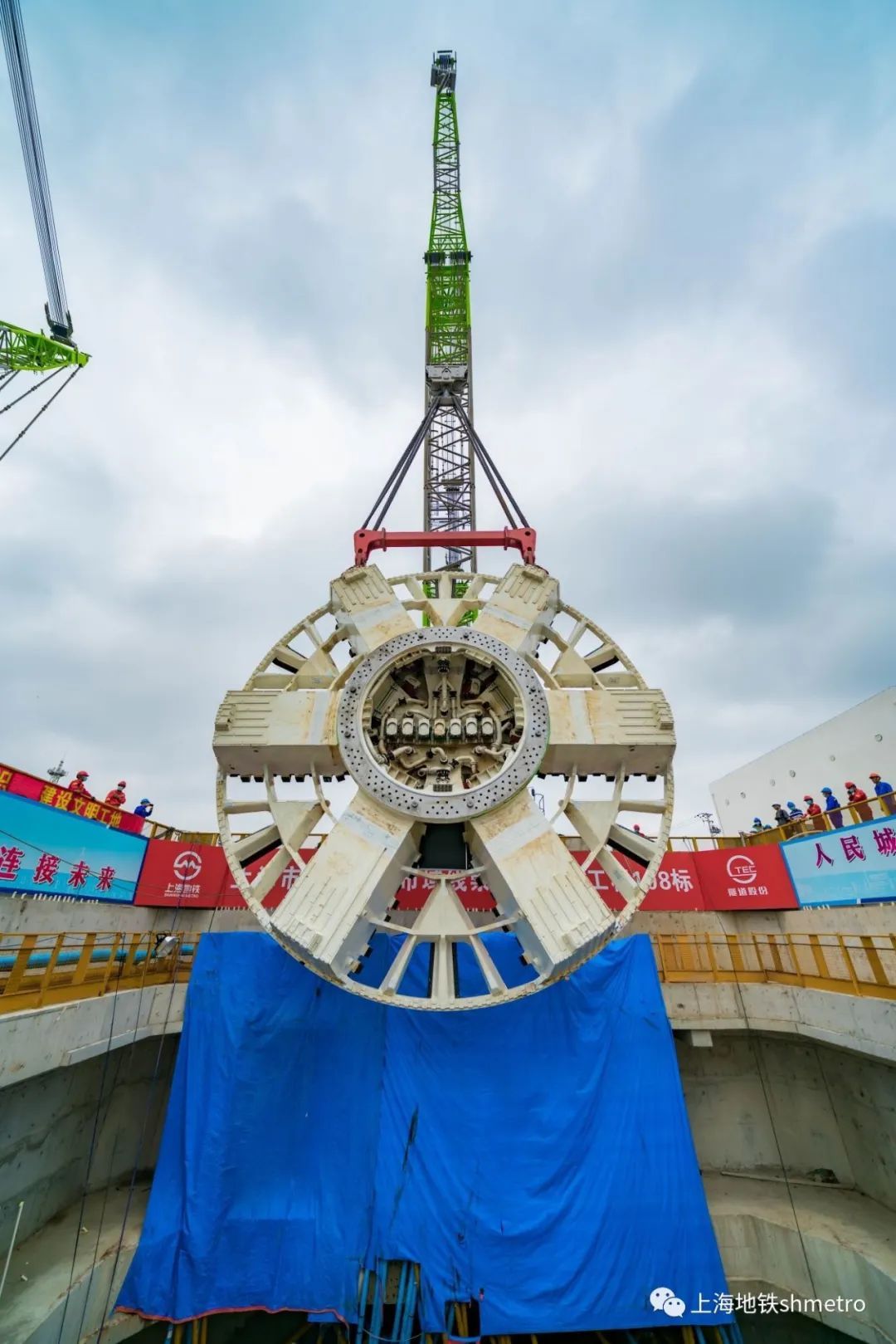 9月12日,正值中秋假期,上海地铁建设工地依旧忙碌,轨道交通崇明线108标正在进行重要节点之一刀盘吊装下井。上午十时,在一台650吨主吊机及一台600吨辅吊的密切配合下,重达308吨的“申通号”盾构机刀盘缓缓从地面吊起完成了“翻身”。