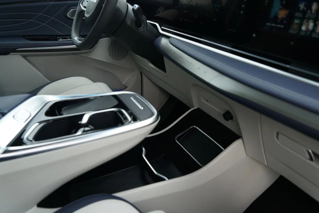与MIFA 9的大体型相比,纤细的方向盘和大车有一种“反差感”。因为MIFA 9采用怀挡设计,所以方向盘左侧拨杆是转向灯、雨刷功能,而外部灯光控制按键以触控形式被置于仪表左侧区域,视觉效果更显高档。MIFA 9前排并不是左右贯通的设计,但中央区域拥有一个开放式储物槽,可以放稍大件的物品,悬浮式设计也使得取放物品更便利。