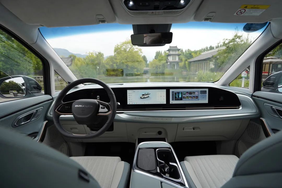 上汽大通MAXUS MIFA 9的前排不是那种商务风格,而是一种很家用的风格。为符合目前的流行趋势,前排几乎没有物理按键,三连屏也很抢眼,很好地提升了科技氛围。车机使用的是双芯,分别是高通8155和联发科8666芯片,运行相当流畅。