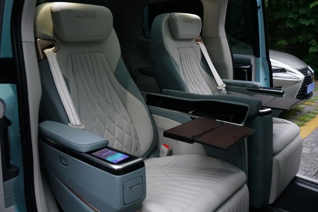 MIFA 9三款“高山版”车型的前排座椅都配备了通风、加热、按摩功能,座椅本身也足够宽大,填充物厚实,所以乘坐舒适性较好。六座版车型的第二排两张独立座椅更是重点,电动调节、加热、通风、按摩、腿托、电动头枕、小桌板、控制屏幕等功能一应俱全,让乘客拥有贵宾头等舱般的享受。内侧扶手翻开后,除了桌板以外,储物槽、电源接口也在这个区域。