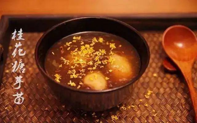 这是一道在金陵地区常见的甜点,由藕粉、芋艿、红糖、桂花制作而成。每年中秋节前后,南京城到处漂浮着淡淡的桂花香,这时候也正巧是芋头成熟的季节,二者搭配便成就了一道顺滑爽口的甜汤。在秋冬,刚出锅的桂花糖芋苗散着阵阵香甜气息,喝下去唇齿留甘,让人欲罢不能。