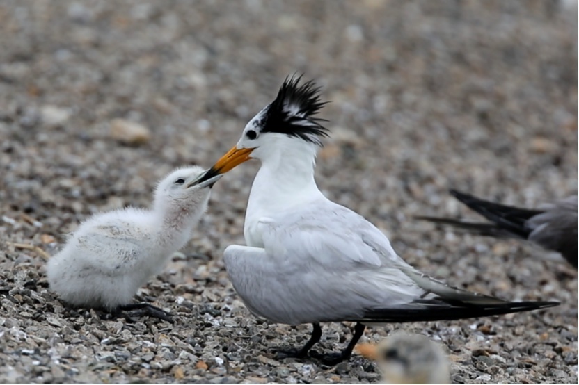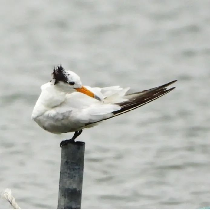 “凤头”形容的是它们后脑那一堆看似杂乱的羽毛。它们曾经还有一个中文名叫黑嘴端凤头燕鸥,也十分形象,因为它们黄色的喙部先端恰好有黑色的斑块。