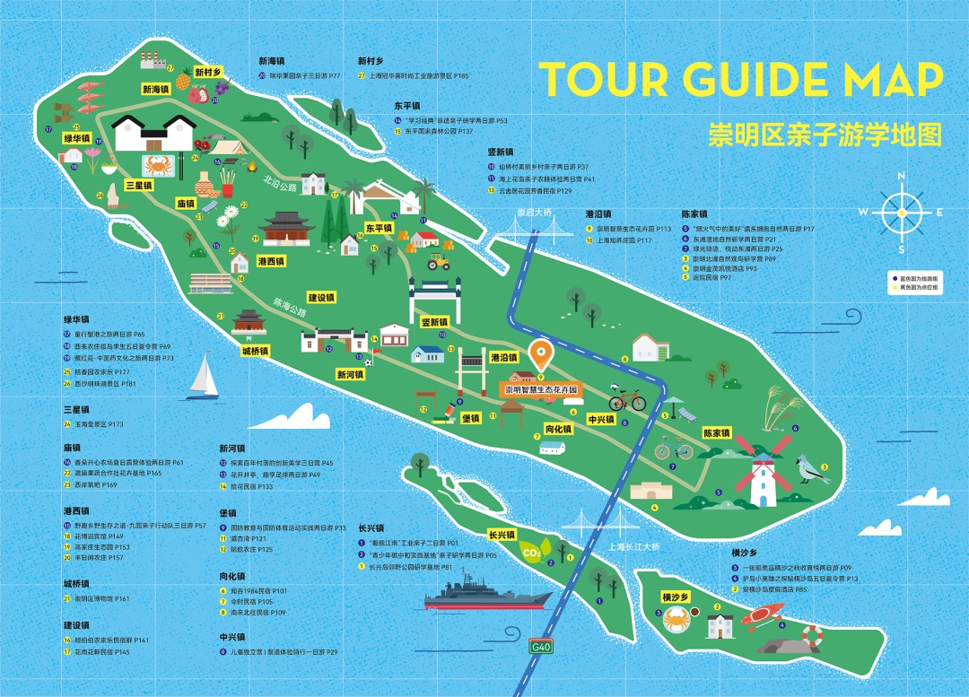 2022年3月起,崇明区妇联、崇明区文化旅游局聚焦家庭亲子主题,围绕“德智体美劳”五育内容,启动“游在崇明 学在路上”亲子游学设计大赛,最终共产生入围对象65个,其中线路20条,点位27个,红色旅游点位18个。每一个点位都独一无二:民宿、酒店、景点、基地……一个都不能少;每一条线路都精彩纷呈:工业游、乡村游、骑行游、野外游、国防体验、足球体验……一站式为你提供史上崇明最全遛娃攻略!