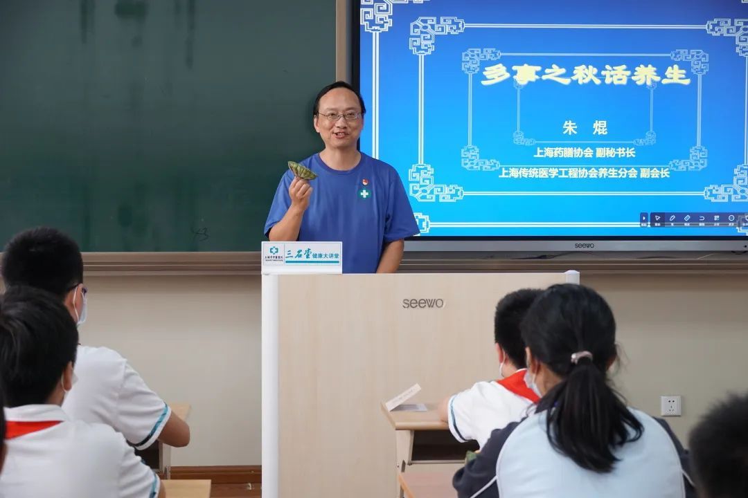 这是上海市中医医院专家、网红医生朱焜为拓展课学生带来的一节主题为《二十四节气药膳食谱——多事之秋话养生》的课堂。朱焜老师将二十四节气与生活中常见的膳食相融合,生动有趣又很接地气,学生们既懂得了养生之道,又对中医药传统文化产生了浓厚的兴趣。
