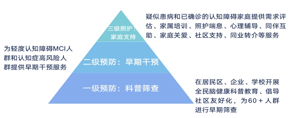 三步走:一级预防治未病,即教育筛查(全民科普、友好化倡导、早期筛查) ----> 二级预防治欲病,即早期干预(为高风险及MCI人群早期非药物干预)----> 三级预防治已病,即家庭支持(非正式照护支持及同业转介服务)