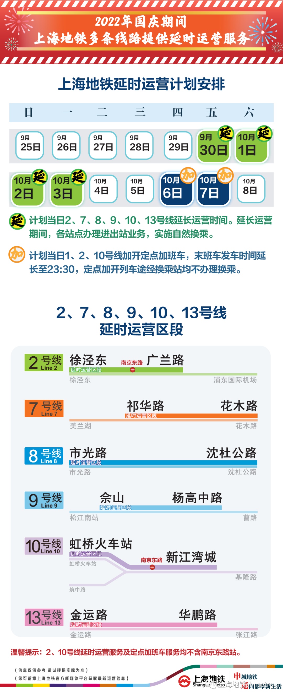 其中,9月30日—10月3日连续四天,地铁2、7、8、9、10、13号线将实施国庆临时延时运营;