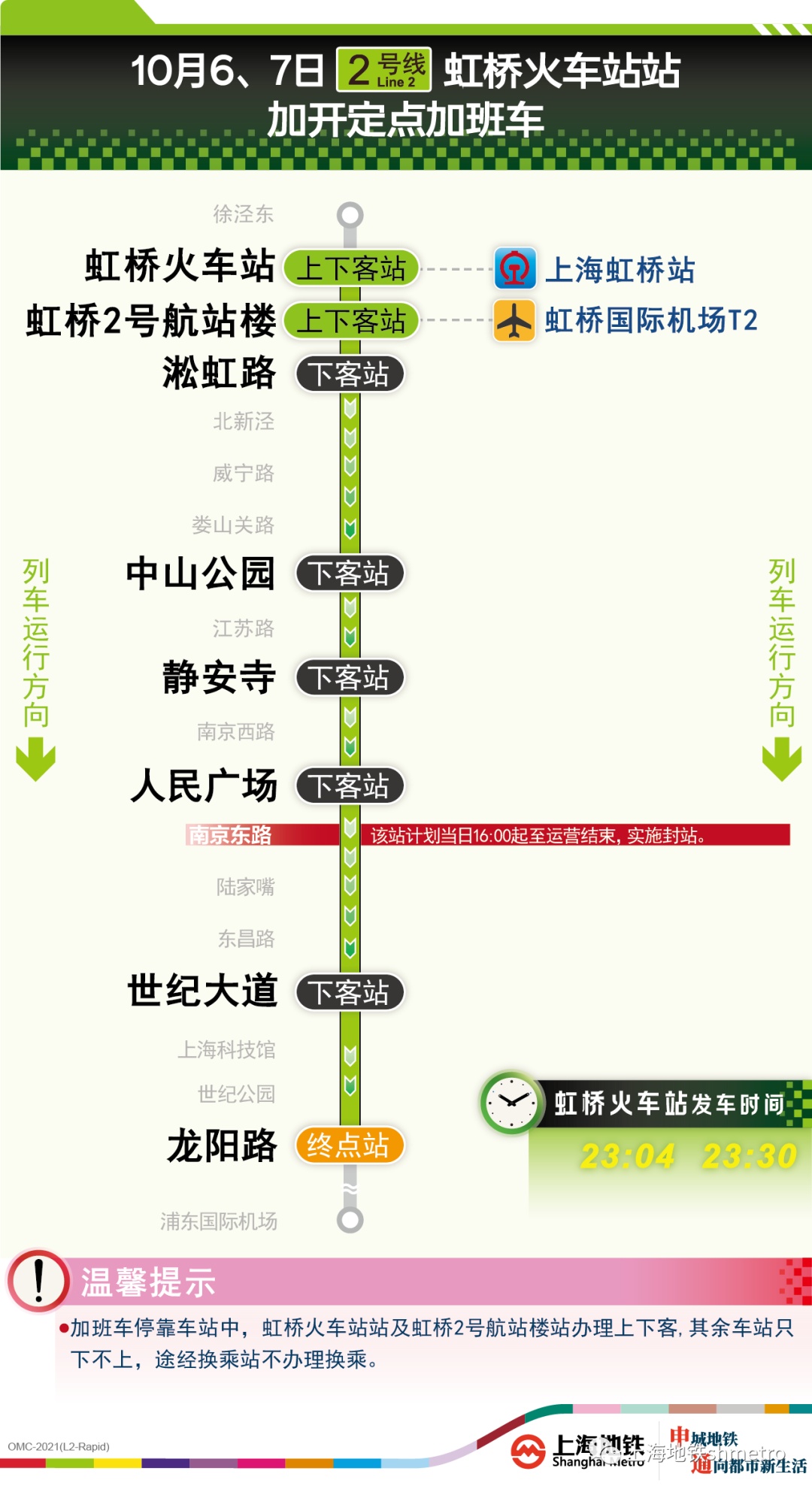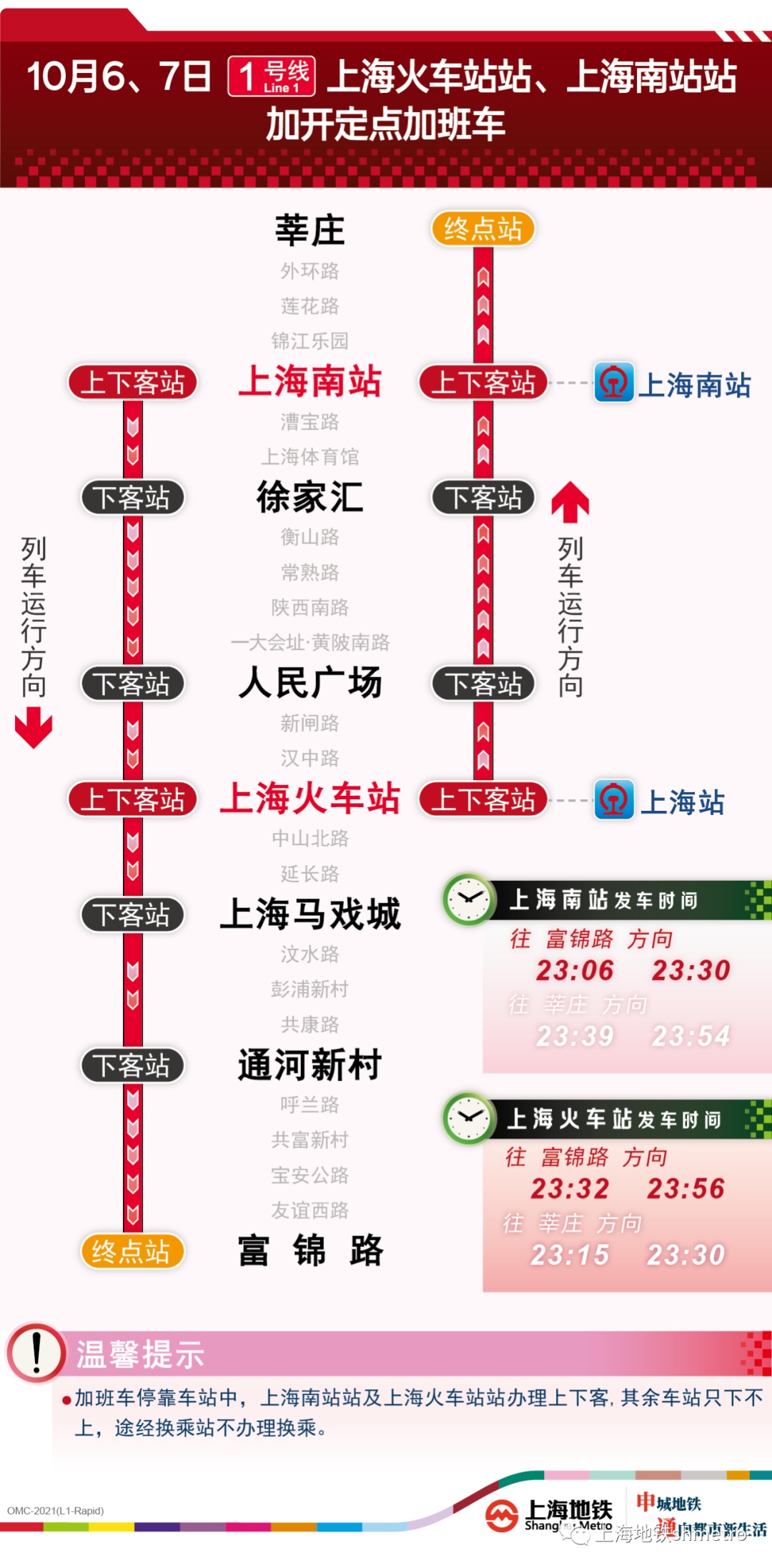 其中,1号线上海南站站往富锦路站方向定点加班车沿途仅停靠徐家汇站、人民广场站、上海火车站站、上海马戏城站、通河新村站、富锦路站,其余车站跳停。停靠车站中,上海南站站、上海火车站站可上下客,其余车站只下不上,途经换乘站不可换乘。