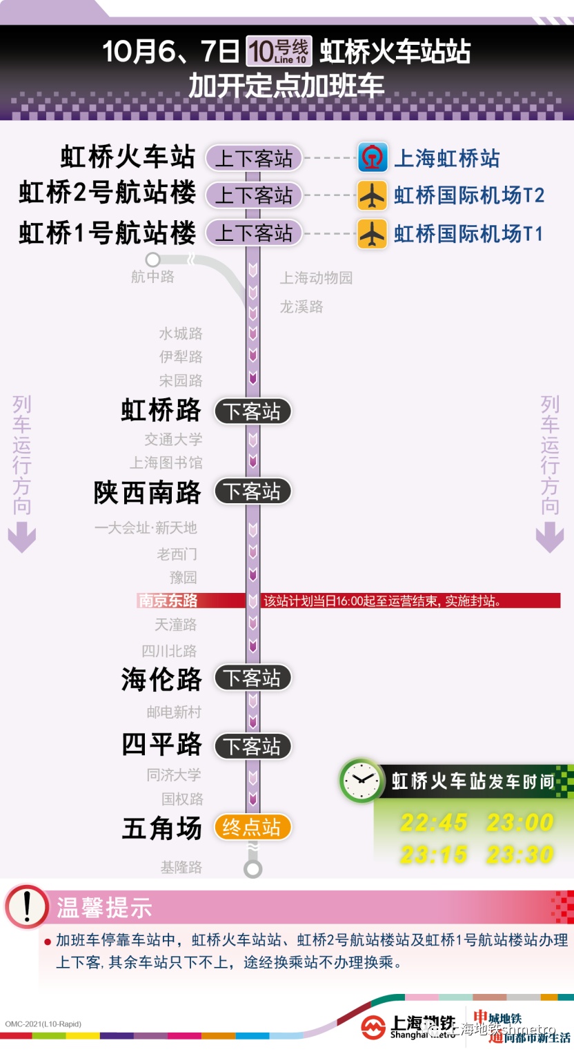 10号线虹桥火车站站往五角场站方向定点加班车,沿途仅停靠虹桥火车站站、虹桥2号航站楼站、虹桥1号航站楼站、虹桥路站、陕西南路站、海伦路站、四平路站、五角场站,其余车站跳停。停靠车站中,虹桥火车站站、虹桥2号航站楼站、虹桥1号航站楼站可上下客,其余车站只下不上,途经换乘站不可换乘。