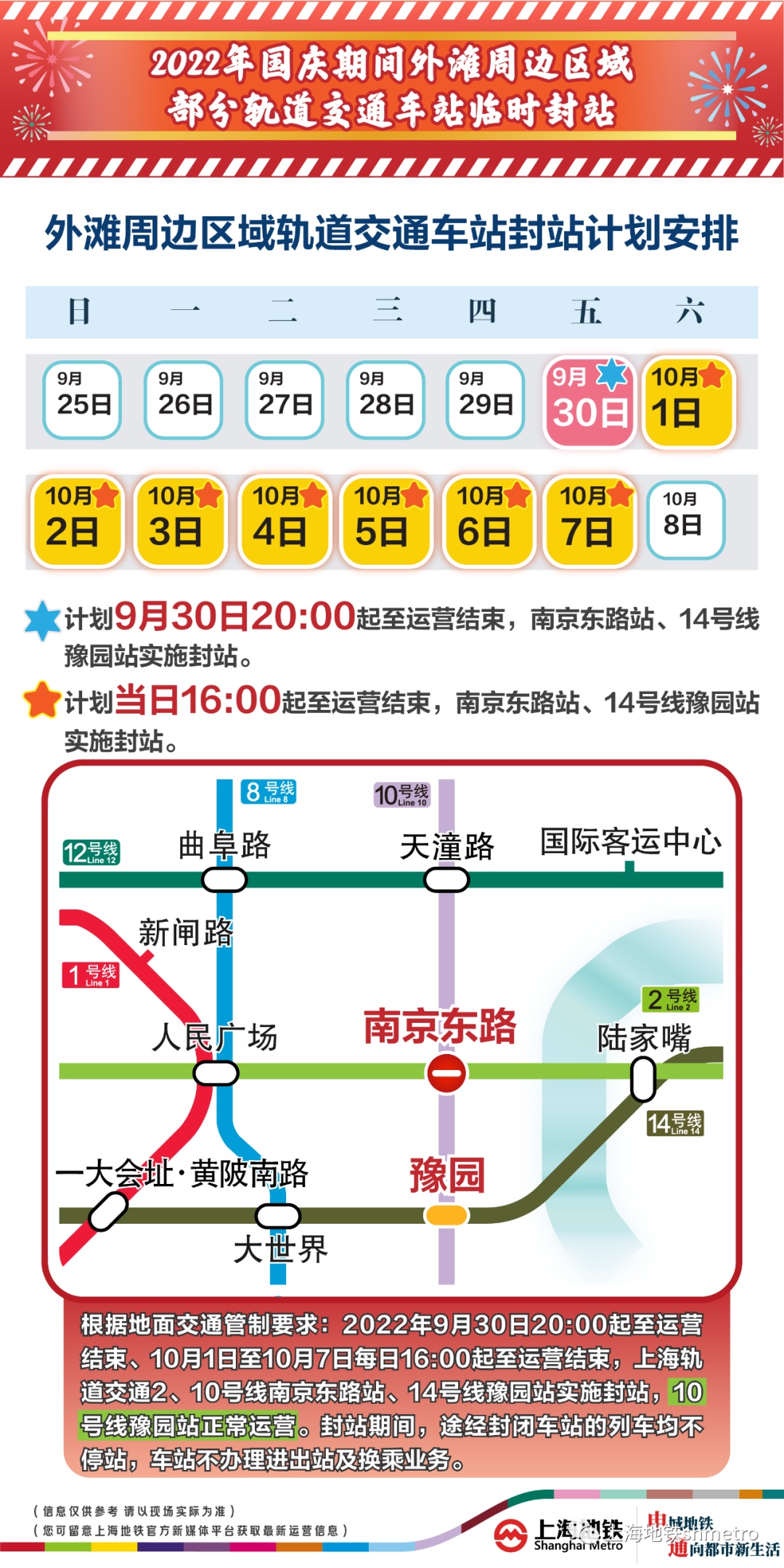 根据交通管制工作方案,9月30日20:00至运营结束,10月1日至10月7日,每日16:00至运营结束,地铁2、10号线南京东路站,14号线豫园站计划实施封站跳停。