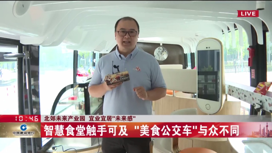 这里的美食也不少,除了一个2000平方米的智慧食堂,还开设了麦当劳、星巴克、24小时全家便利店等。这个像是公交车的车辆,其实是美食公交车,可以在吧台上享受美食,味道也与众不同。