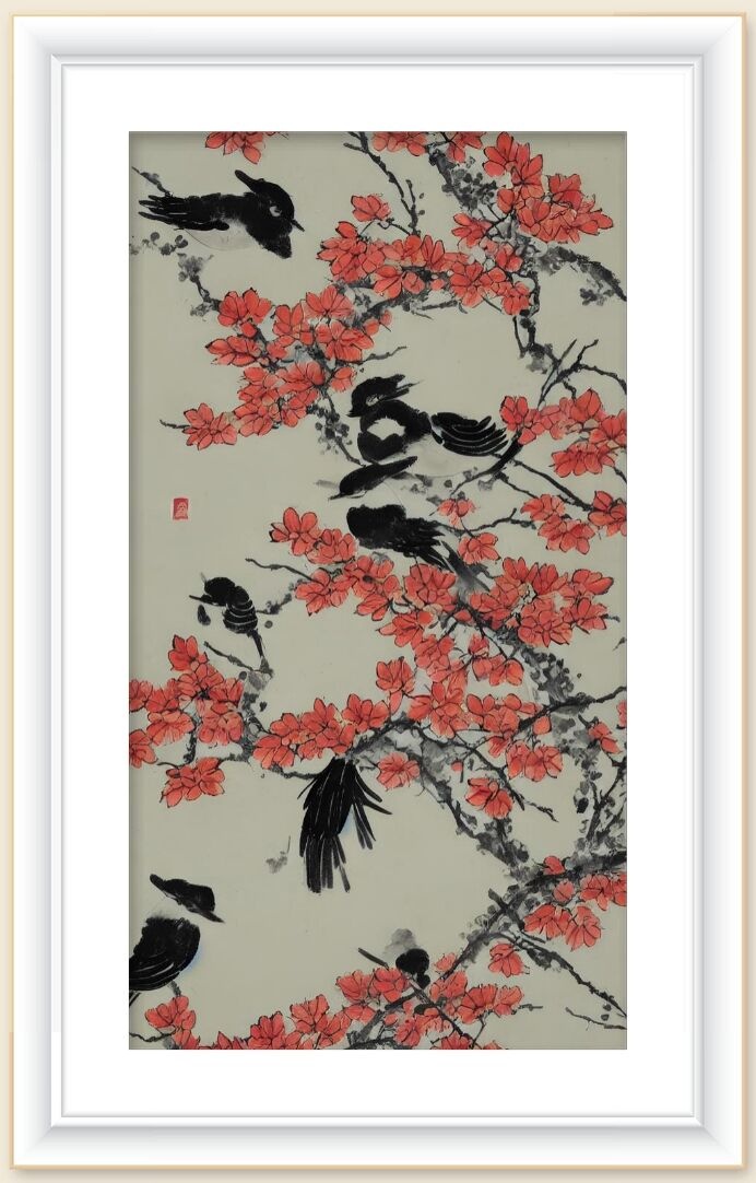 AI画家盗梦师将视线落在了枝丫上嬉戏的小鸟,层层红叶是它们游乐的场所,叽叽喳喳地唱着秋日欢歌。