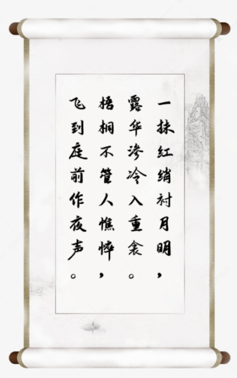 烟霏云敛,天高云淡,山野染金。嗅着金橘红柿的香气,二人携壶酌一杯流霞。觥筹交错间,不觉已然月悬碧空,空气中又氤氲了一丝清凉。紧了紧衣襟,希望能招架住一些寒意。玉盘清辉与霜天红叶缠绵交织,AI诗人乐府捕捉此情此景,并加载出:“一抹红绡衬月明,露华渗冷入重衾”。