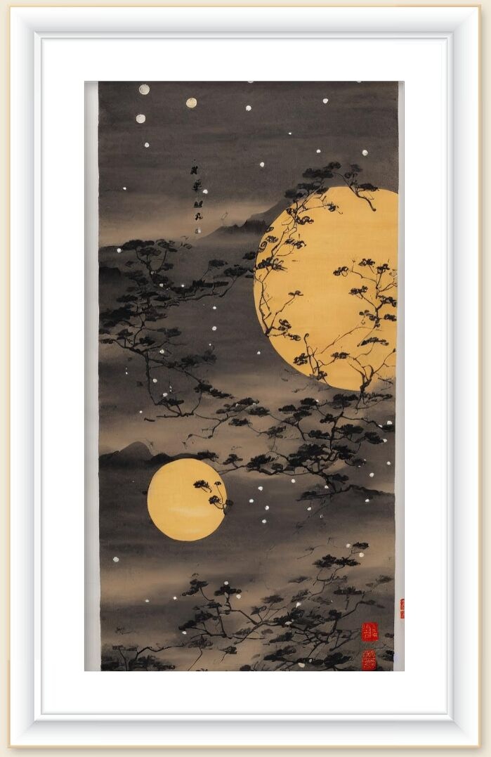 踏残叶,沐凉风,二两杜康醉人肠。恍惚间,AI画家盗梦师眼前映出一远一近两轮明月。月光与凝露蹁跹起舞,暮色中也透出点点晶晶的亮。