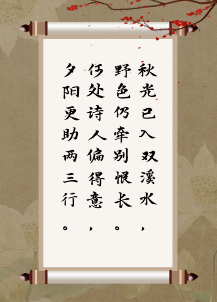 红叶满寒溪,一路空山万木齐。走入山林,秋光浸入野色,泱泱心绪随着淙淙溪流肆意徜徉。AI诗人乐府精密计算出“秋光已入双溪水,野色仍牵别恨长”来描写此景。