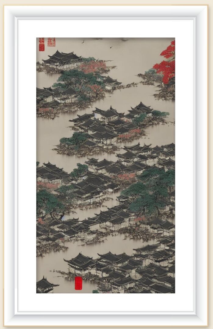 骋怀游目,点点红枫飘散在无垠乡野之间,高低错落的楼台将AI画家盗梦师的思绪越拉越长。驻足凝视,似是能从这江南水乡望穿故里。