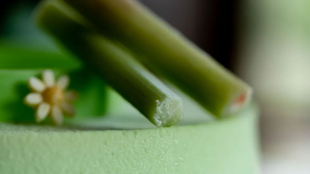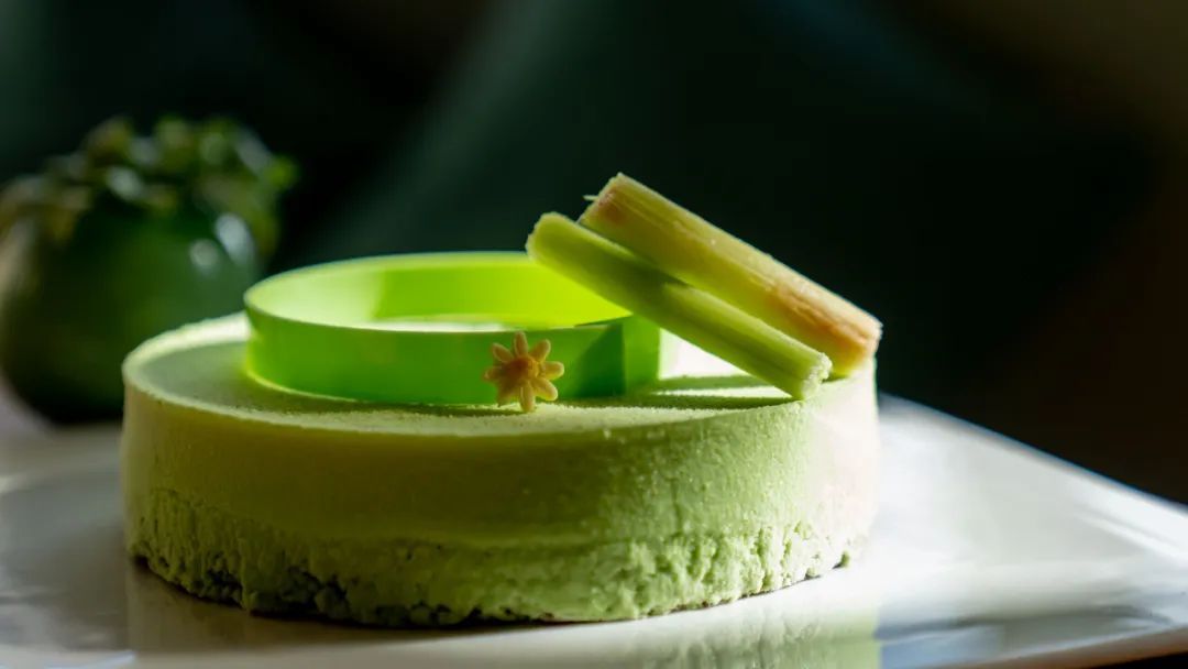 淡绿色的蛋糕,散发着浓浓的芝士香味,乍一看还以为是抹茶蛋糕,不过蛋糕上点缀着两截甜芦粟,却在暗示我们,它或许没那么普通。原来,它就是酒店的特色甜品——甜芦粟奶酪芝心蛋糕。